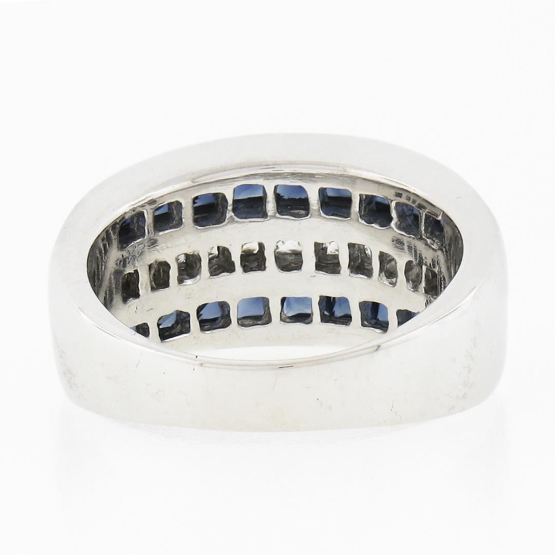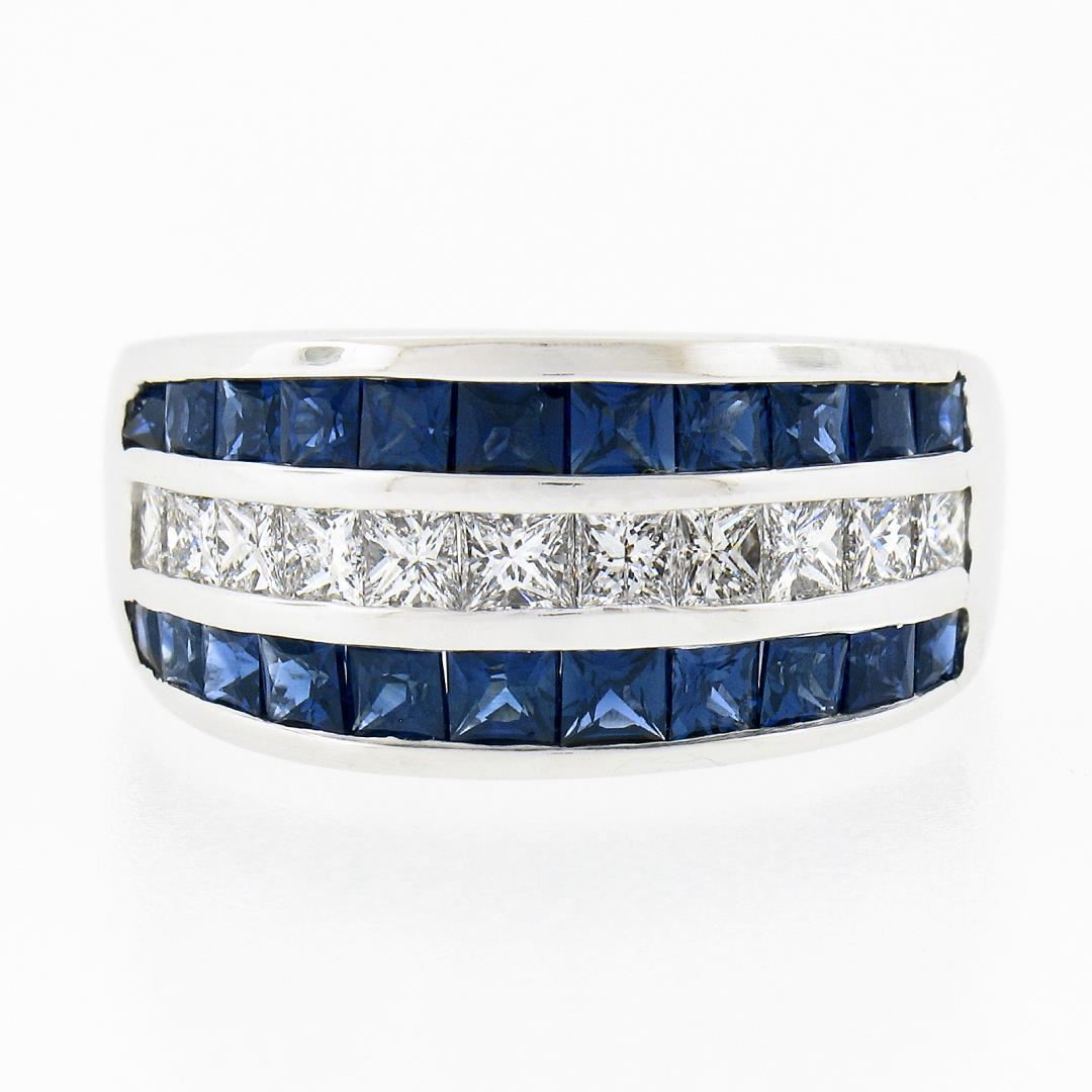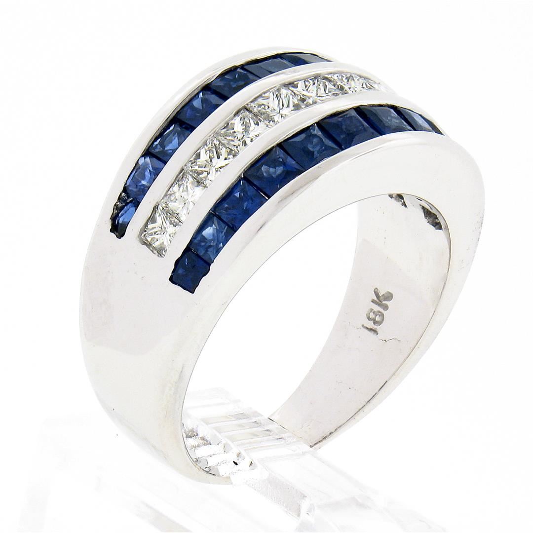A solid 18k white gold band ring, with 11 princess cut natural diamonds (F/G - VS1/VS2 ; 1.0ctw), and 22 Square cut natural sapphires ( 2.20ctw ). The ring is size 7.5, weighs a total of 12.32 grams, and measures 10.8mm wide.