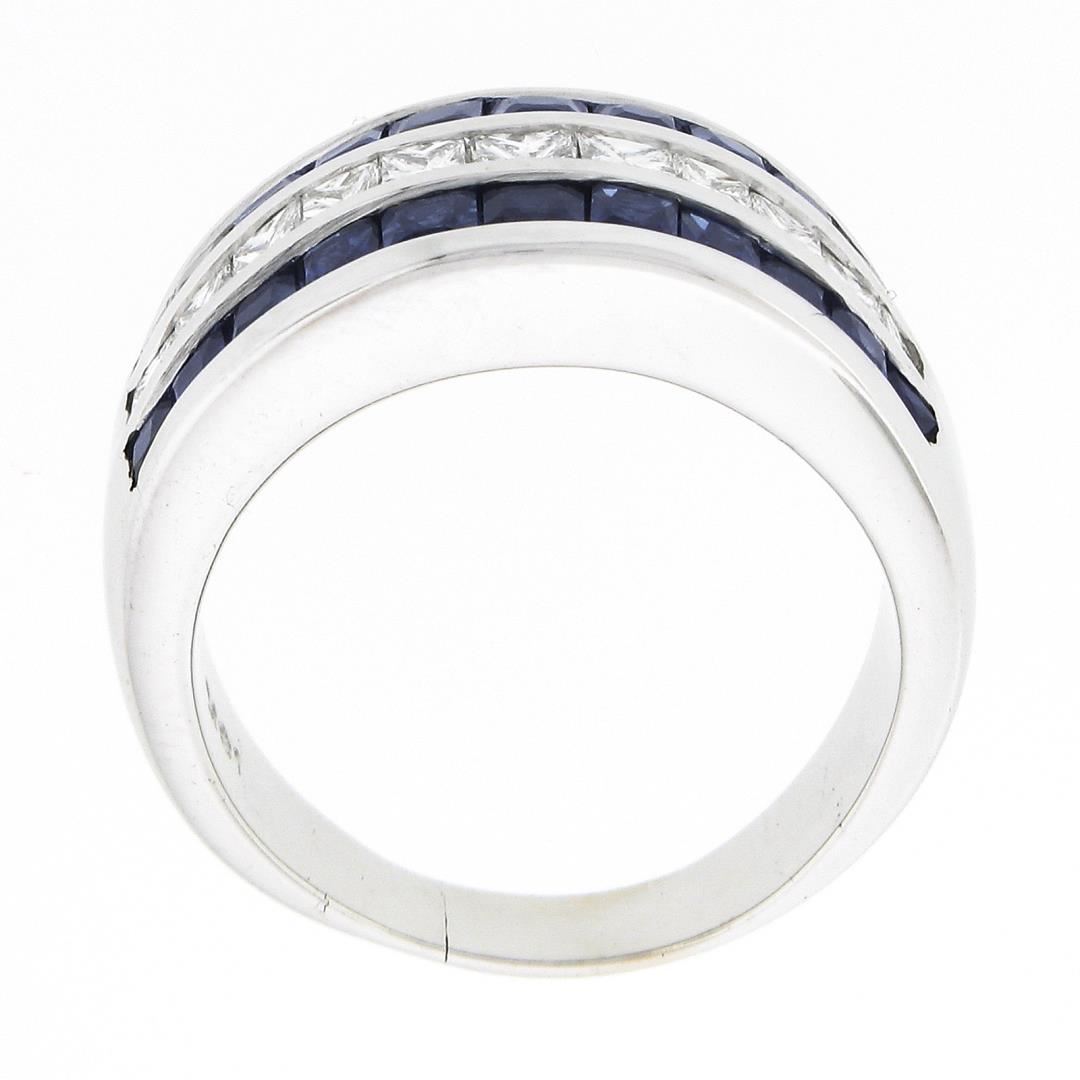 A solid 18k white gold band ring, with 11 princess cut natural diamonds (F/G - VS1/VS2 ; 1.0ctw), and 22 Square cut natural sapphires ( 2.20ctw ). The ring is size 7.5, weighs a total of 12.32 grams, and measures 10.8mm wide.