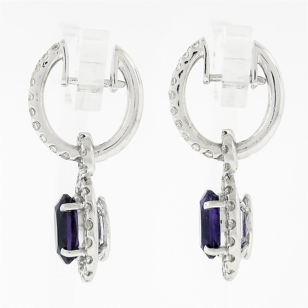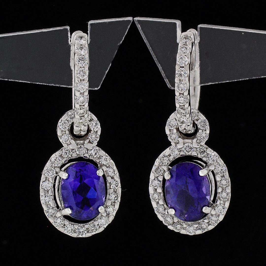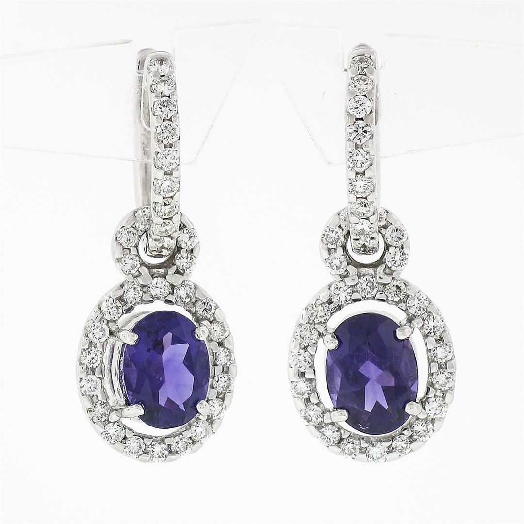 A solid 18k white gold dangle drop earrings, featuring 2 oval cut natural amethysts (7.85x5.95mm - 2.40ct), and 72 round brilliant cut natural diamonds (F/G - VS1/VS2; 1.40ct). The earrings measure approximately 27.75x11mm and weigh a total of 6.84 grams.