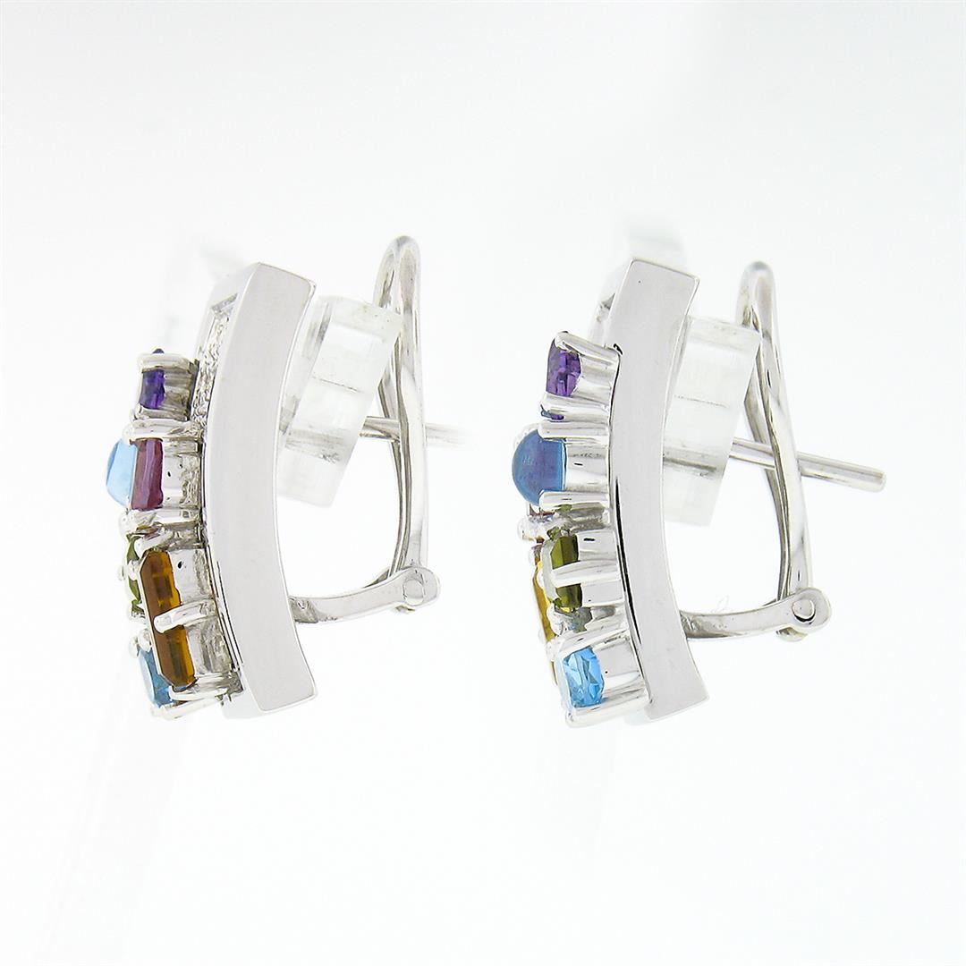 A solid 18k white gold cluster cuff earrings, with 2 oval cut natural tourmalines (5.0x4.0mm - 0.62ctw), 4 oval cut natural topaz (5.0x4.2mm - 0.74ctw & 3.6mm - 0.52ctw), 2 rectangular step cut natural peridots (5.0x3.1mm - 0.58ctw), 2 rectangular step cut natural citrines (6.10x3.25mm - 0.62ctw, 2 square princess cut natural amethysts (3.0mm - 0.18ctw, & 22 round brilliant cut natural diamonds (H/I - VS1/VS2 ; 0.16ctw)The earrings measure approximately 19.88x14.77mm and weigh a total of 15.65 grams.