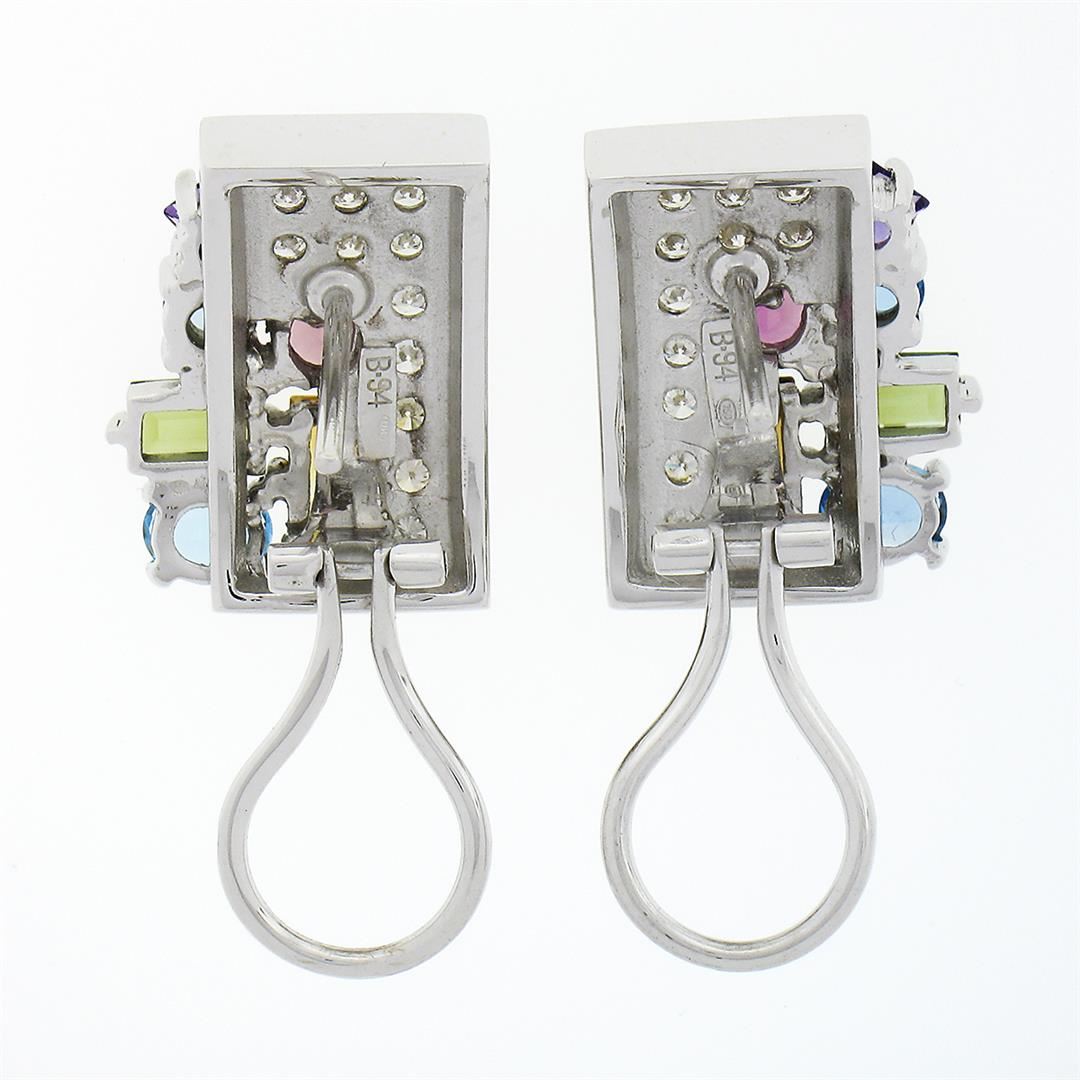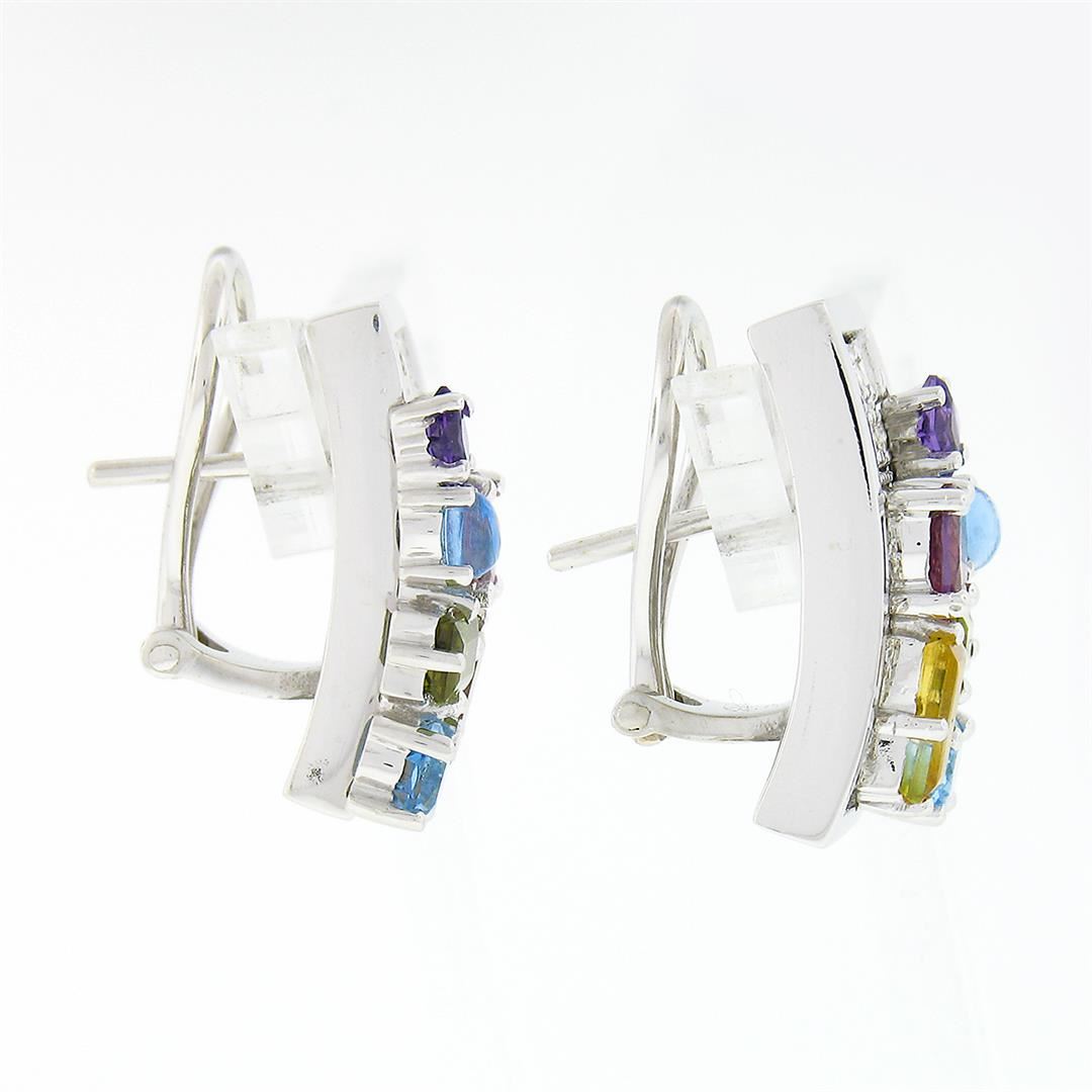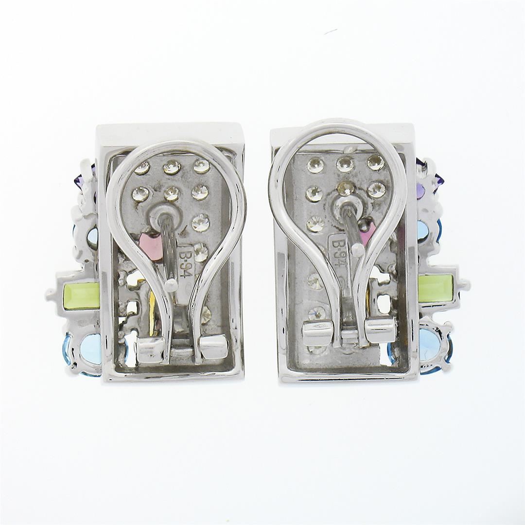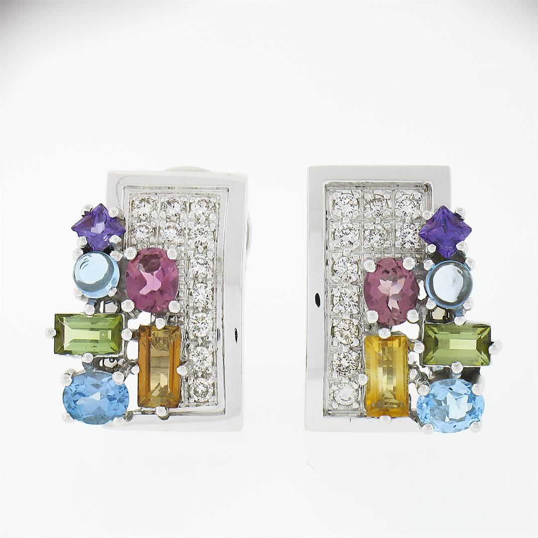 A solid 18k white gold cluster cuff earrings, with 2 oval cut natural tourmalines (5.0x4.0mm - 0.62ctw), 4 oval cut natural topaz (5.0x4.2mm - 0.74ctw & 3.6mm - 0.52ctw), 2 rectangular step cut natural peridots (5.0x3.1mm - 0.58ctw), 2 rectangular step cut natural citrines (6.10x3.25mm - 0.62ctw, 2 square princess cut natural amethysts (3.0mm - 0.18ctw, & 22 round brilliant cut natural diamonds (H/I - VS1/VS2 ; 0.16ctw)The earrings measure approximately 19.88x14.77mm and weigh a total of 15.65 grams.