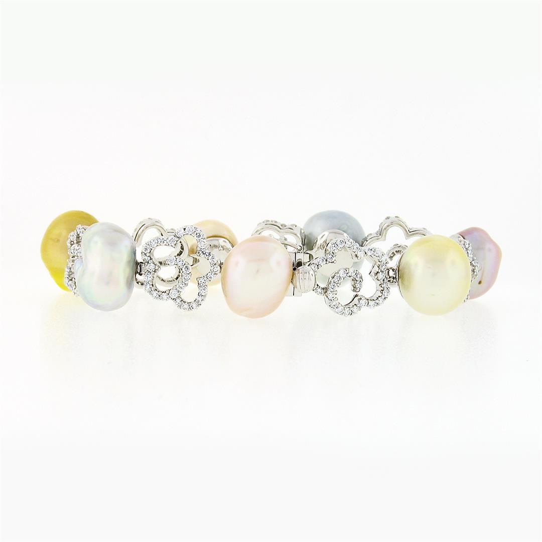 A solid 18k white gold bracelet, featuring 7 multi color baroque shape natural south sea pearls, & 201 round brilliant cut natural diamonds (VS1/VS2 ; E/F - 3.0ctw). It weighs a total of 37.64 grams, and measures 6.25 inches in length.