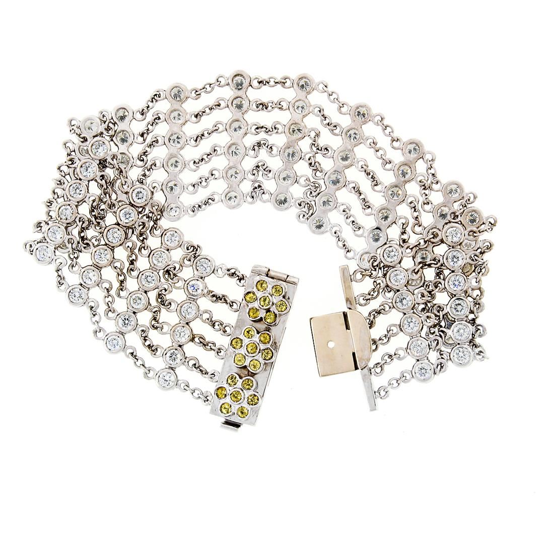 A solid 18k white gold, 6 row, "by the yard" bracelet with 21 round brilliant cut natural yellow sapphires (0.65ctw) and 90 round brilliant cut natural diamonds (F/G - VS1/VS2; 6.00ctw). It weighs a total of 9.44 grams, measures 27.62mm wide, and measures 6 3/4 inches in length.