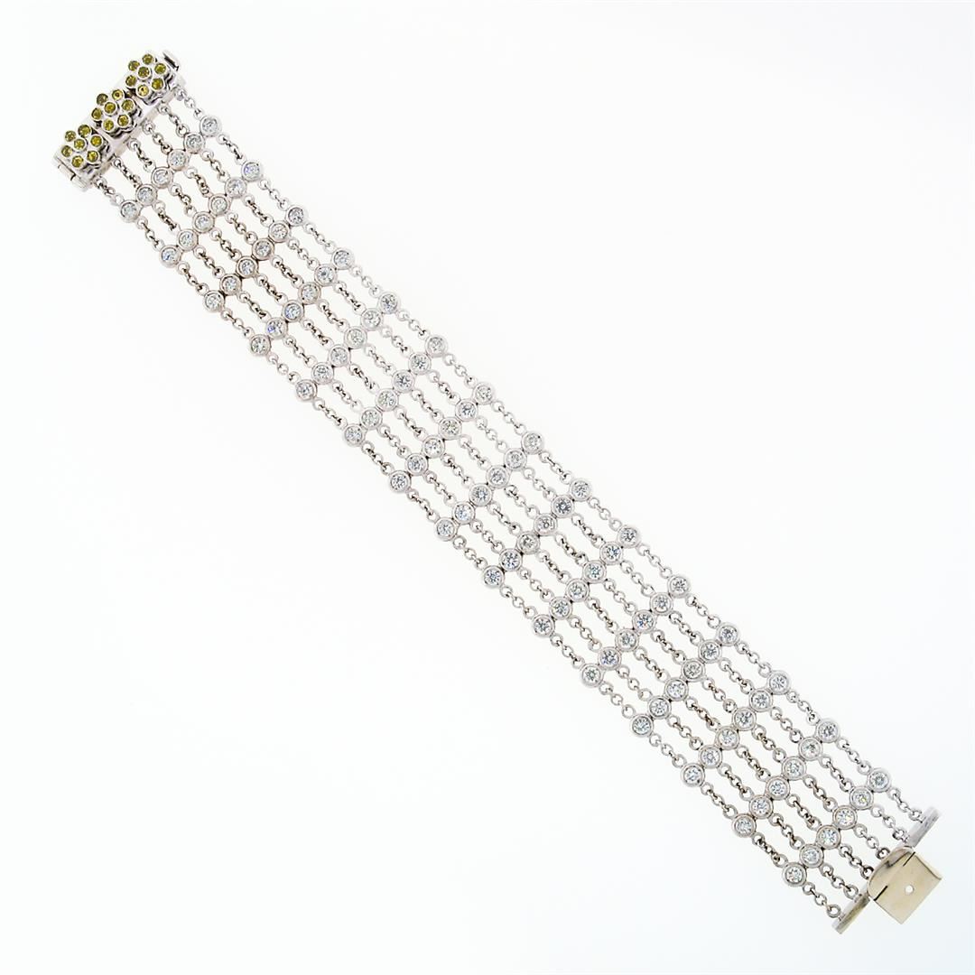 A solid 18k white gold, 6 row, "by the yard" bracelet with 21 round brilliant cut natural yellow sapphires (0.65ctw) and 90 round brilliant cut natural diamonds (F/G - VS1/VS2; 6.00ctw). It weighs a total of 9.44 grams, measures 27.62mm wide, and measures 6 3/4 inches in length.