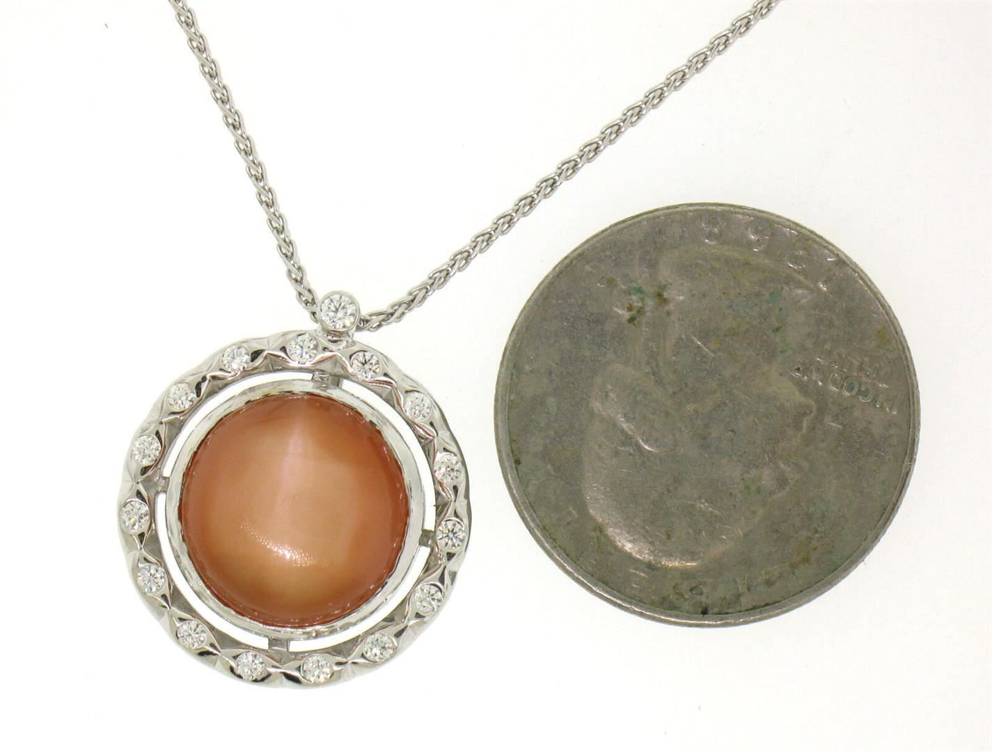 18k White Gold 7.59ctw Peach Orange Bezel NATURAL Moonstone Diamond Halo Pendant. Please see photos and description for all available information. An estate solid 18k white gold pendant necklace, featuring 1 rounf cabochon cut natural moonstone (14mm in diameter - 7.29ct), with a halo of 16 round brilliant cut natural diamonds (E - VS1; 30ctw). The pendant weighs a total of 10.80 grams, measures 20mm in diameter, 18 inch wheat link chain.