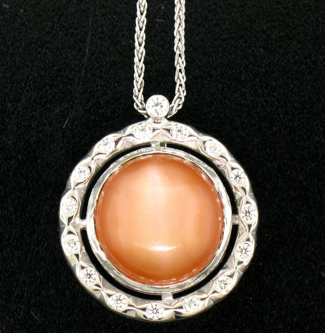 18k White Gold 7.59ctw Peach Orange Bezel NATURAL Moonstone Diamond Halo Pendant. Please see photos and description for all available information. An estate solid 18k white gold pendant necklace, featuring 1 rounf cabochon cut natural moonstone (14mm in diameter - 7.29ct), with a halo of 16 round brilliant cut natural diamonds (E - VS1; 30ctw). The pendant weighs a total of 10.80 grams, measures 20mm in diameter, 18 inch wheat link chain.