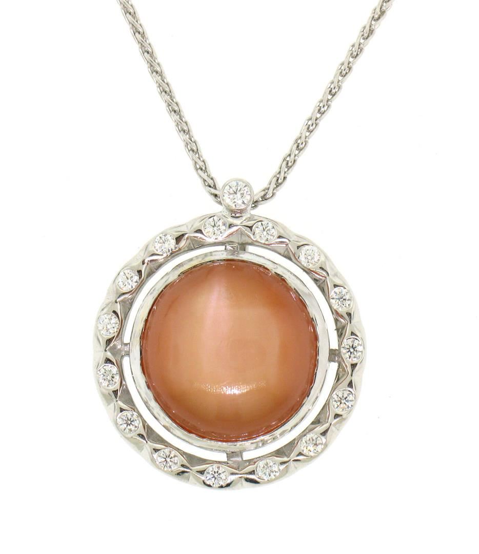 18k White Gold 7.59 ctw Peach Orange Bezel NATURAL Moonstone Diamond Halo Pendan