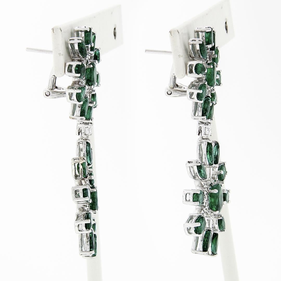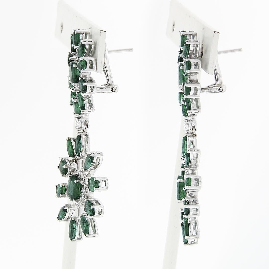 A solid 18k white gold drop dangle earrings, with 74 round cut natural diamonds (G/H - VS1/VS2 ; 0.48ctw), and 44 oval marquise & pear cut natrual emeralds (7.80ctw). The earrings measure approximately 47.75x21.6mm and weigh a total of 14.44 grams.