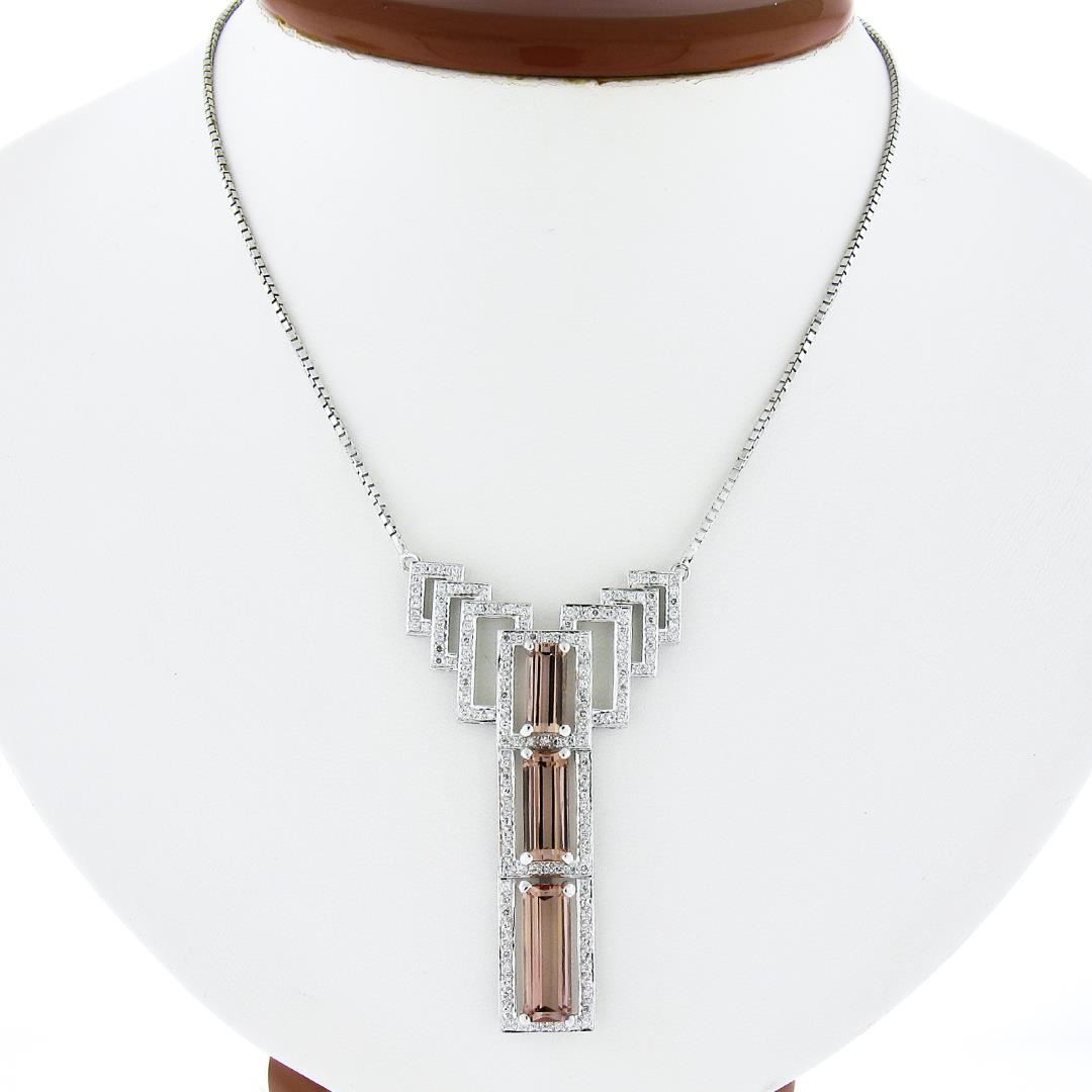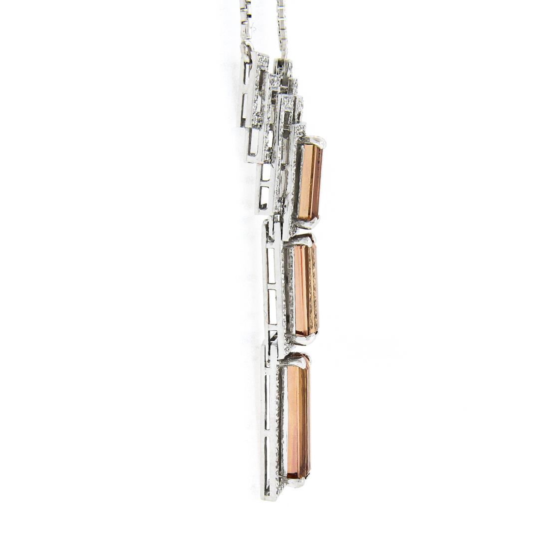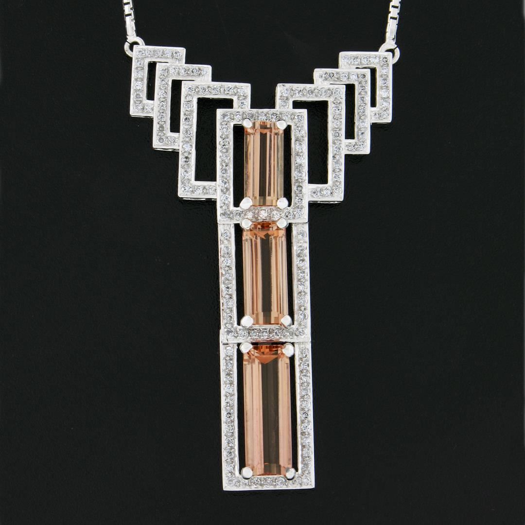 A solid 18k white gold pendant necklace. with GIA graded 3 elongated emrald cut natural imperial topaz (8.40ctw), and 159 round brilliant cut natural diamonds (F/G - VS2/SI1 ; - 1.50ctw). 16 inch box link chain, 9.90 grams total weight, pendant measures 54.80x32.80mm. Comes with all original relevant certifications.
