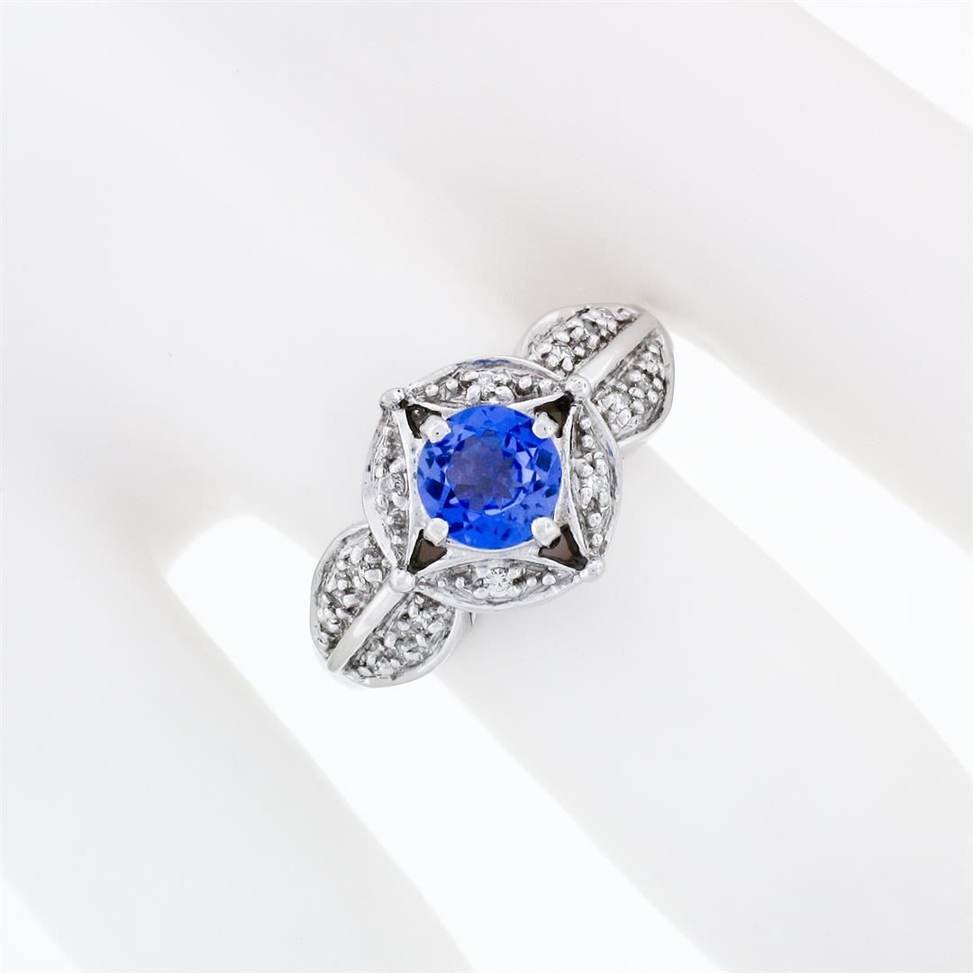 An estate solid 18k white gold ring, with 1 round brilliant cut natural tanzanite (0.78ct), and 16 round brilliant cut natural diamonds (G/H - VS2 ; 0.16ctw). The ring is size 7.0, weighs a total of 5.55 grams, and measures 11.7mm wide.