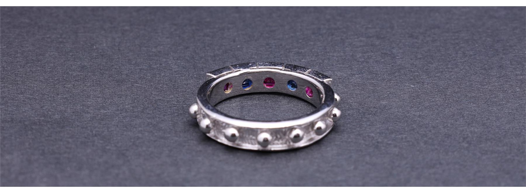 A rare 18k white gold designer half loop eternity ring by Carlo Rici, from a limited 1990s design, bezel set on top with five square set rubies and sapphires, each of good color, the shank decorated overall with round gold beads within a linier border, th