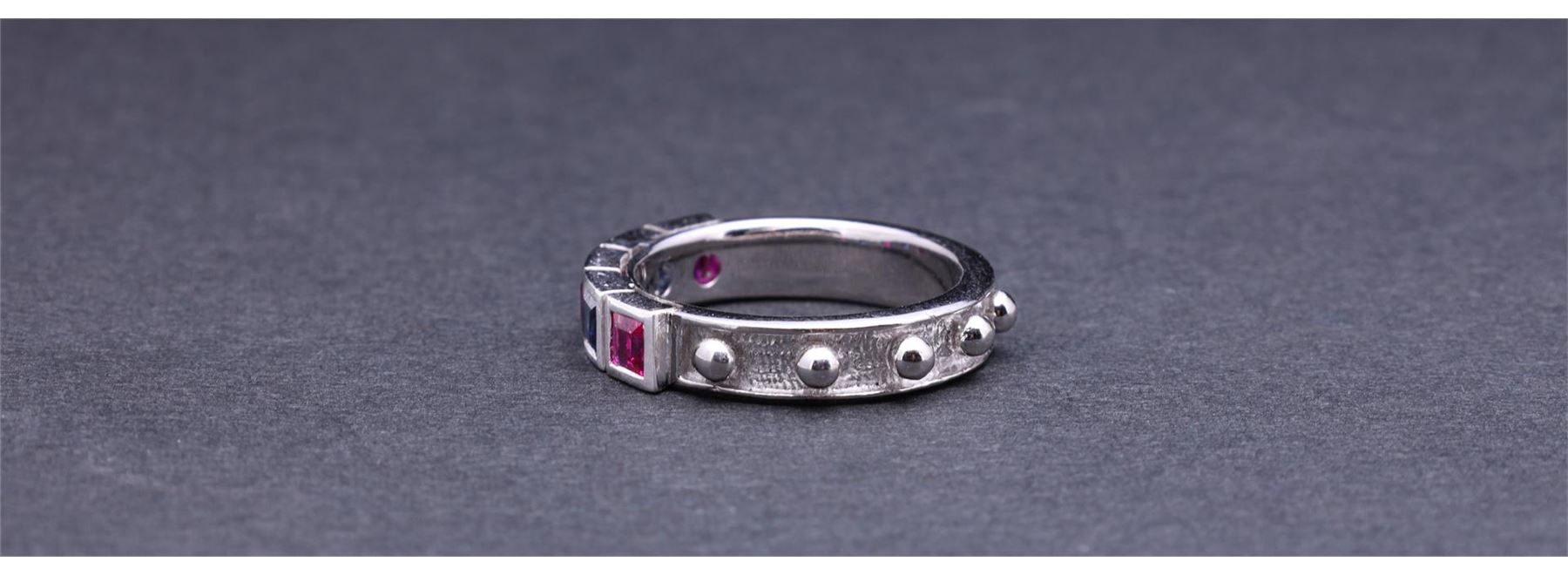 18k White Gold Half Loop Eternity Ring by Carlo Rici containing three square cut ruby weighing approximately 0.70 cts and two blue sapphire weighing approximately 0.42 cts Total weight is 6.6 gm. Estimated retail value $2,250.