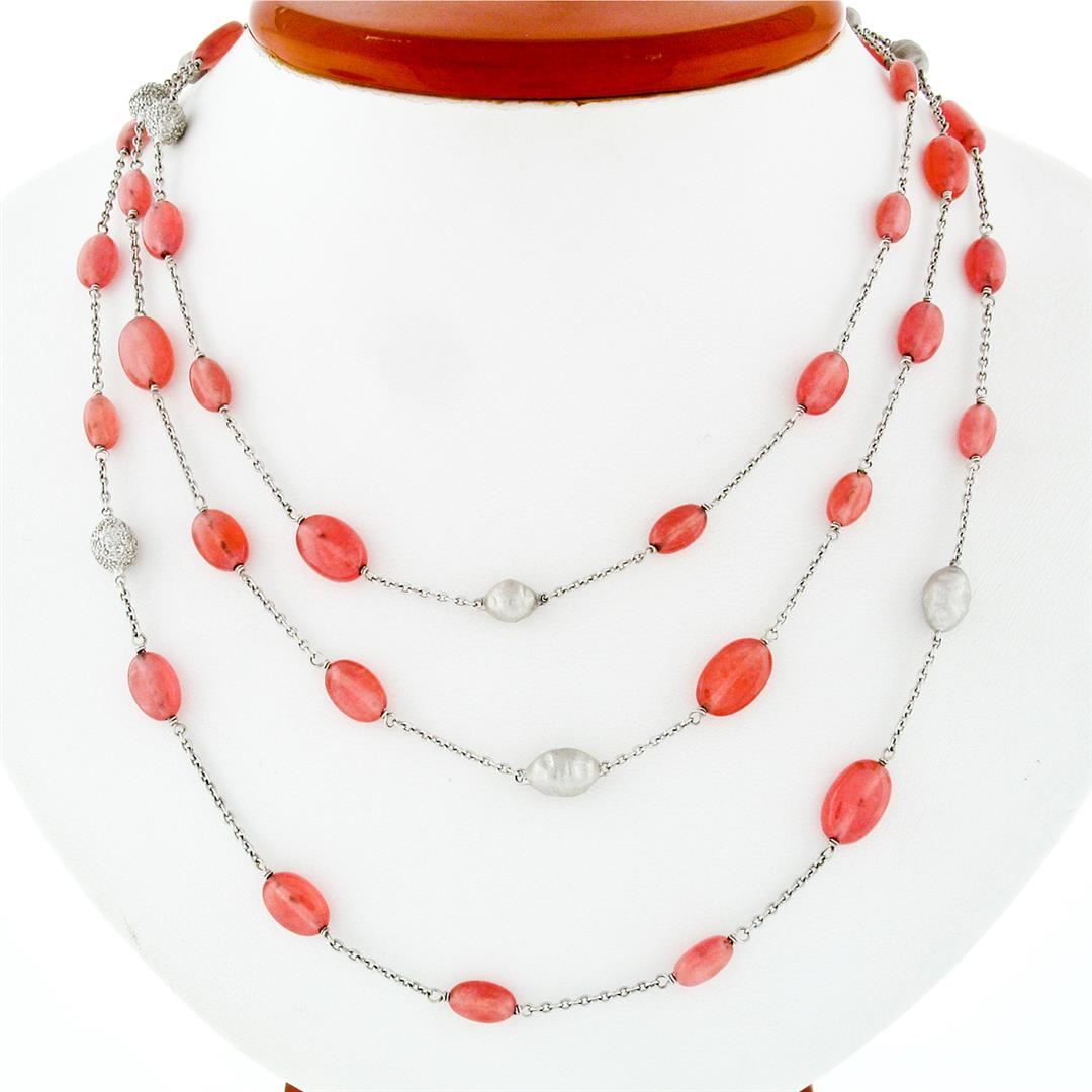 An estate solid 18k white gold by the yar chain necklace, with 39 tumbled polished flat oval vead natural rose quartz (7.7x4.8mm - 11.1x7.3mm), and 120 round brilliant cut natural diamonds (G/H - VS2 ; 0.60ctw). 50 inch cable link chain, 31.04 grams total weight, chain width measures 7.27mm.