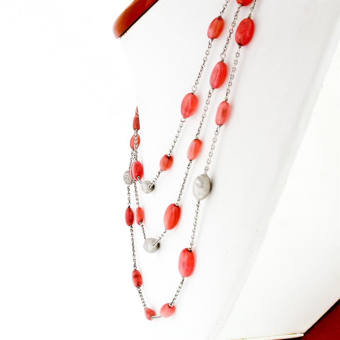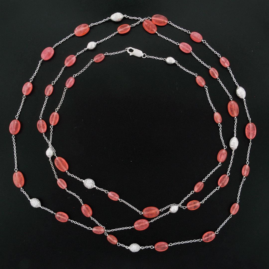 An estate solid 18k white gold by the yar chain necklace, with 39 tumbled polished flat oval vead natural rose quartz (7.7x4.8mm - 11.1x7.3mm), and 120 round brilliant cut natural diamonds (G/H - VS2 ; 0.60ctw). 50 inch cable link chain, 31.04 grams total weight, chain width measures 7.27mm.