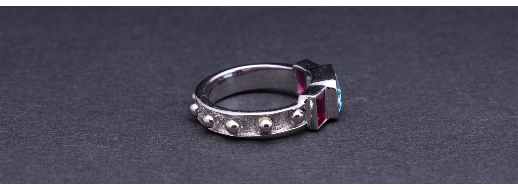 18k White Gold Ring by Carlo Rici containing one emerald cut blue topaz weighing approximately 1.6 cts and two rubies weighing approximately 0.72 cts Total weight is 5.8 gm. Estimated retail value $1,700.