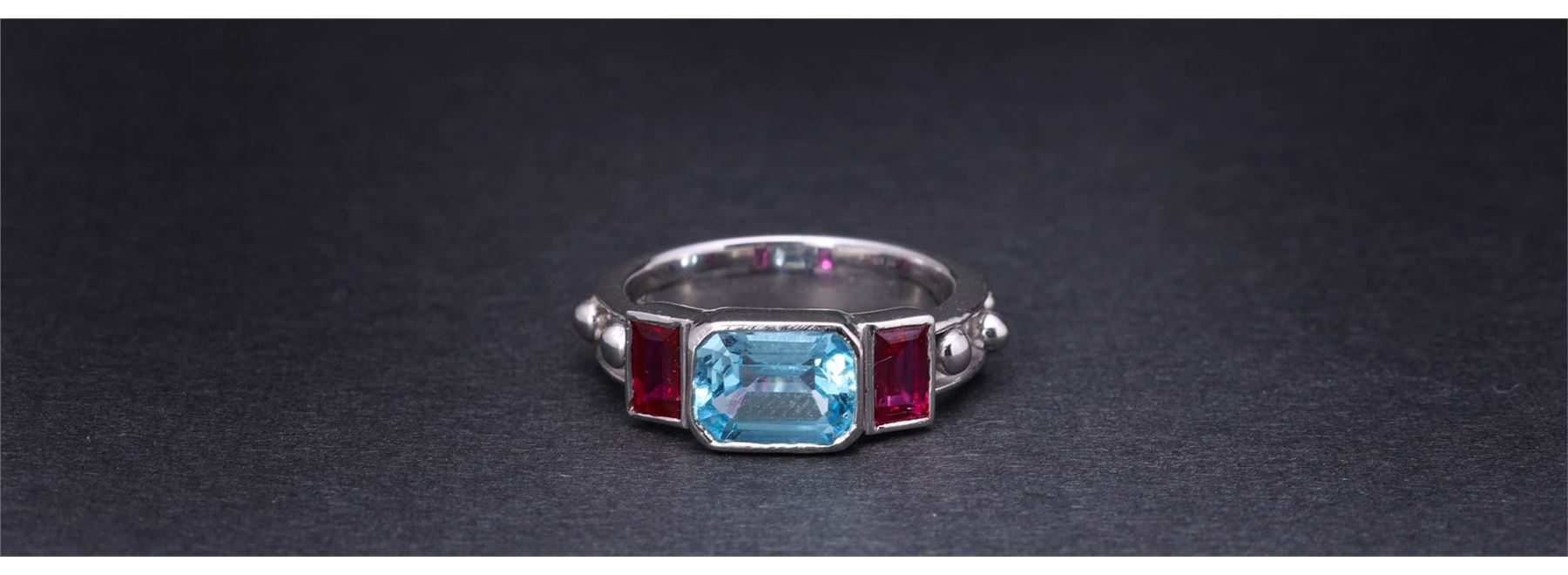 18k White Gold Ring by Carlo Rici containing one emerald cut blue topaz weighing approximately 1.6 cts and two rubies weighing approximately 0.72 cts Total weight is 5.8 gm. Estimated retail value $1,700.