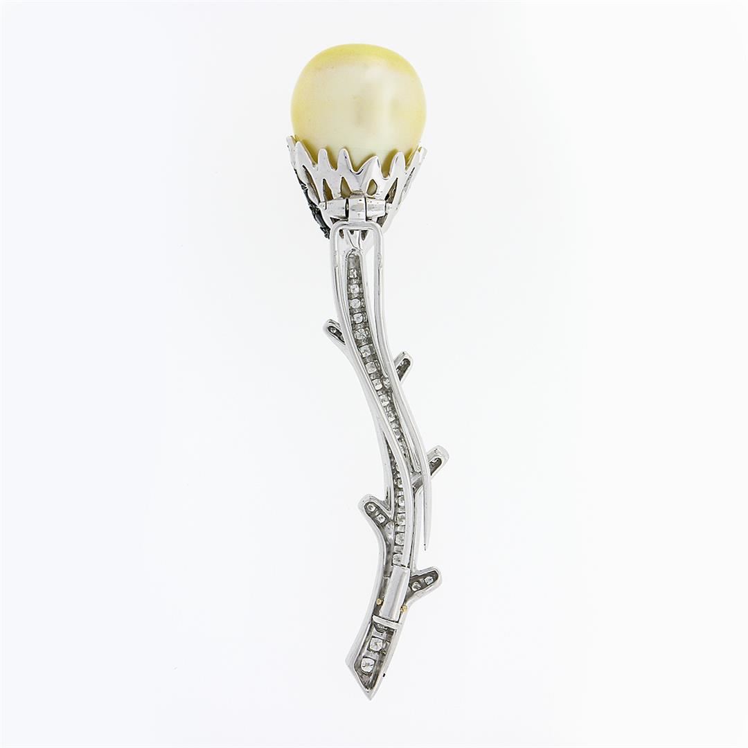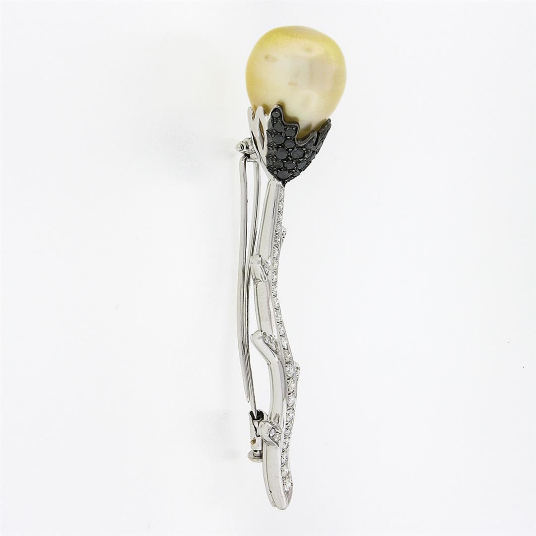 A solid 18k white gold flower brooch, with 1 semi round shape south sea pearl (15.5mm), and 32 round brilliant cut natural black diamonds (1.18ctw), and 32 round brilliant cut natural diamonds (F/G - VS1/VS2 ; 1.30ctw). Measures 75.20x16.20mm and weighs a total of 16.52 grams.