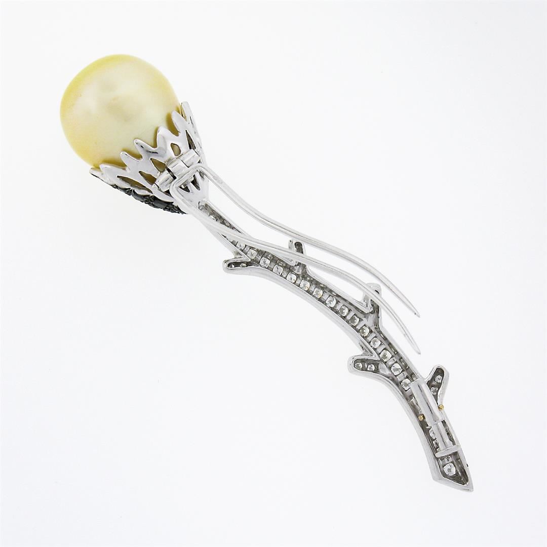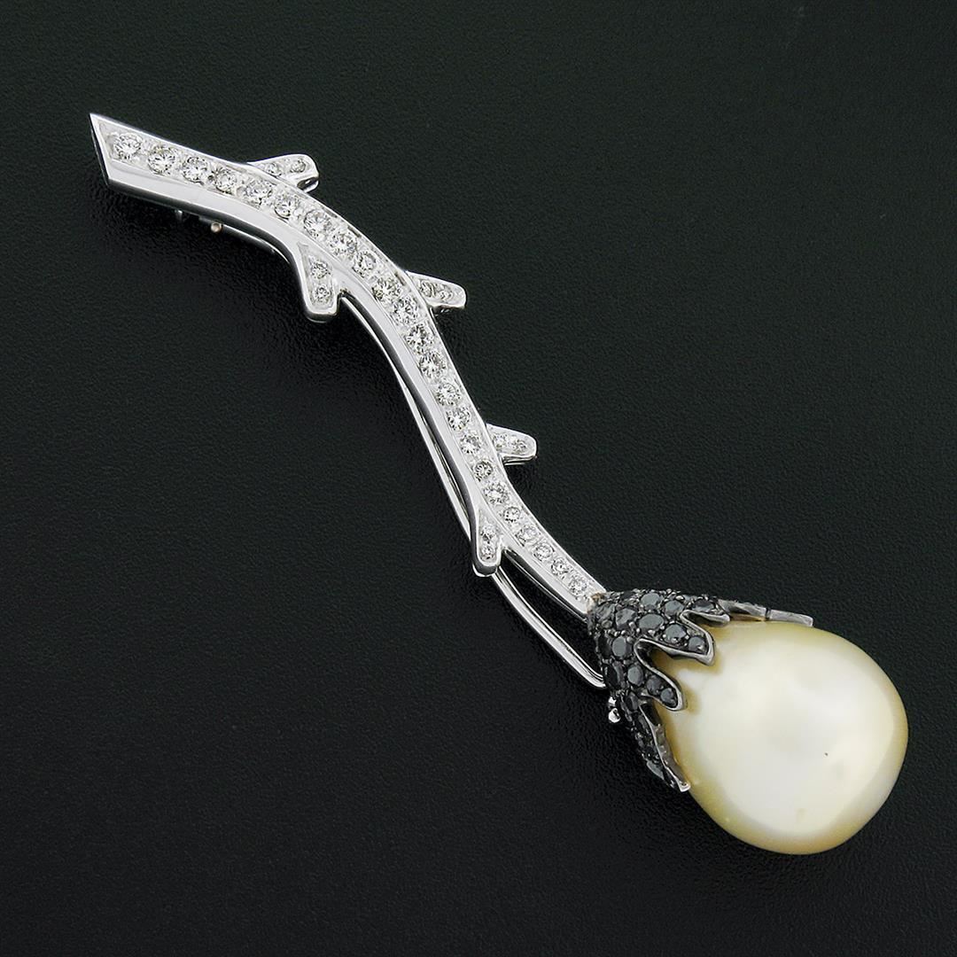 A solid 18k white gold flower brooch, with 1 semi round shape south sea pearl (15.5mm), and 32 round brilliant cut natural black diamonds (1.18ctw), and 32 round brilliant cut natural diamonds (F/G - VS1/VS2 ; 1.30ctw). Measures 75.20x16.20mm and weighs a total of 16.52 grams.
