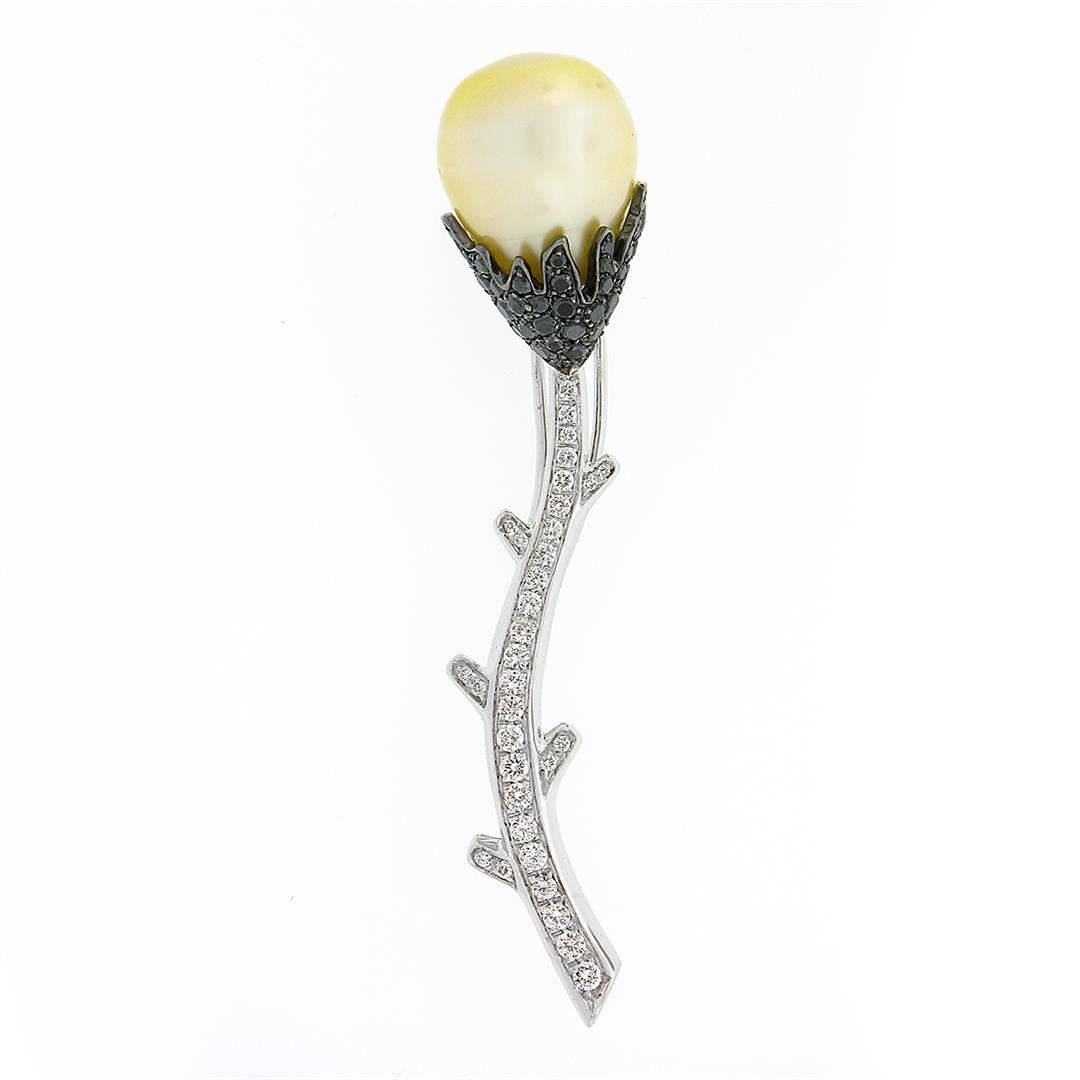 A solid 18k white gold flower brooch, with 1 semi round shape south sea pearl (15.5mm), and 32 round brilliant cut natural black diamonds (1.18ctw), and 32 round brilliant cut natural diamonds (F/G - VS1/VS2 ; 1.30ctw). Measures 75.20x16.20mm and weighs a total of 16.52 grams.