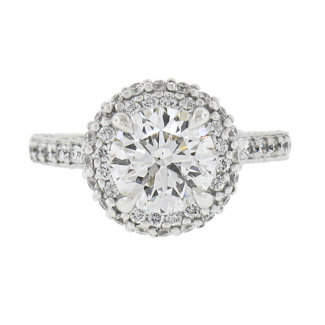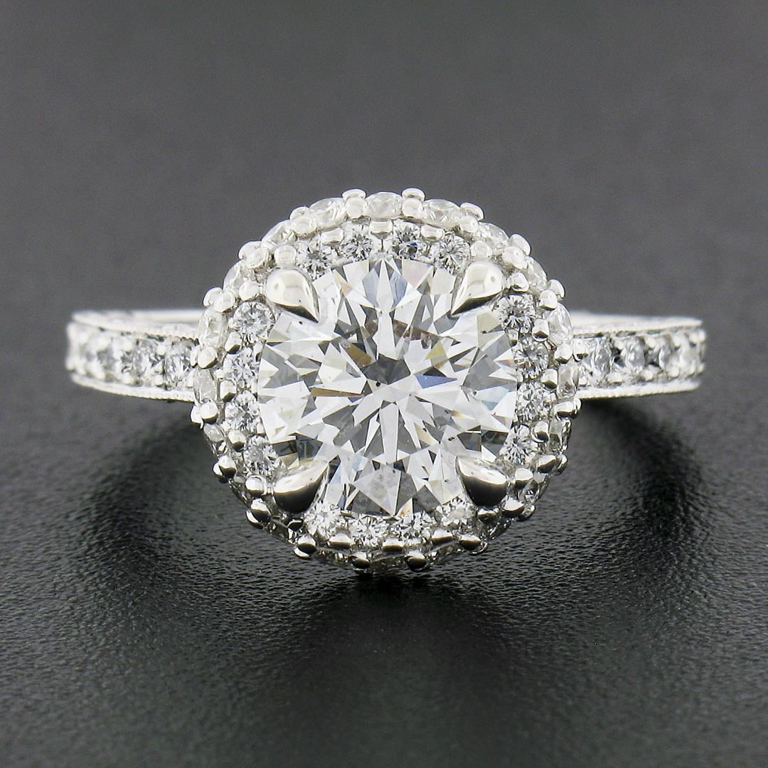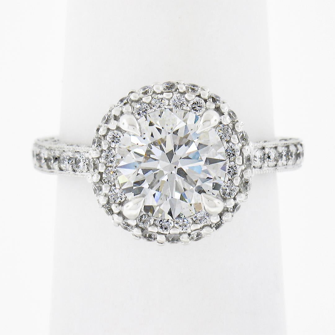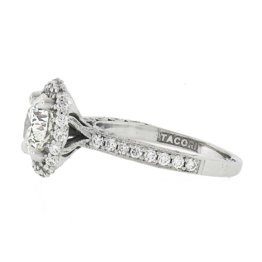 A solid 18k white gold engagement ring by Tacori, with 1 GIA graded 1 round cut natural diamond (H- SI1 ; 1.71ct ), and 78 round cut natural diamonds (G/H - VS1/VS2 ; 0.80ctw). The ring is size 5.5, weighs a total of 4.55 grams, and measures 11.7mm wide. Comes with all original relevant certifications.