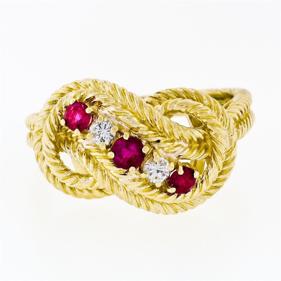 An estate solid 18k yellow gold braided knot ring, with 3 round cut natural rubies (0.38ctw), and 2 round brilliant cut natural diamonds (G - VS2 ; 0.12ctw). The ring is size 9, weighs a total of 7.34 grams, and measures 11.95mm wide.