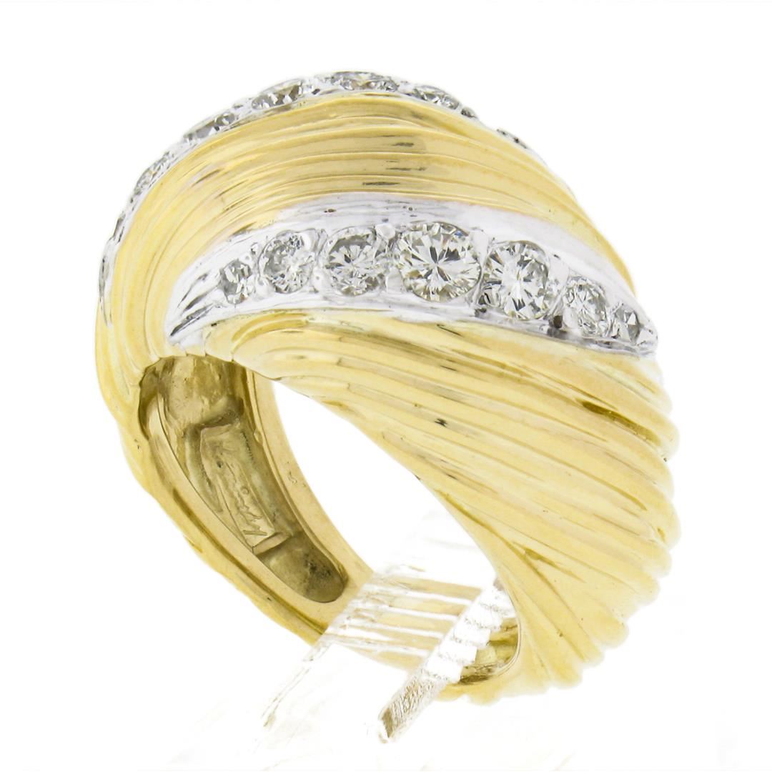 A solid 18k yellow & white Gold bombe ring, with 14 round cut natural diamonds (G-I - VS2-SI2 ; 0.56ctw). The ring is size 4.5, weighs a total of 9.47 grams, and measures 12.4mm wide.