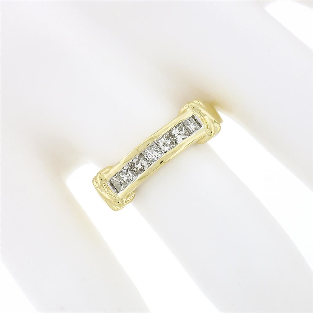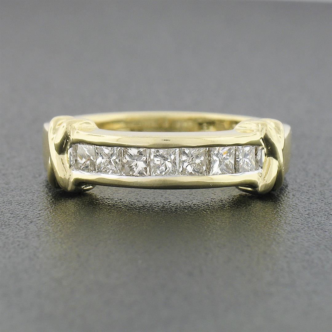 A solid 18k yellow gold band ring, with 7 princess cut natural diamonds (G/H - VS2/SI2 ; 0.70ctw). The ring is size 6.5, weighs a total of 5.11 grams, and measures 6.0mm wide.