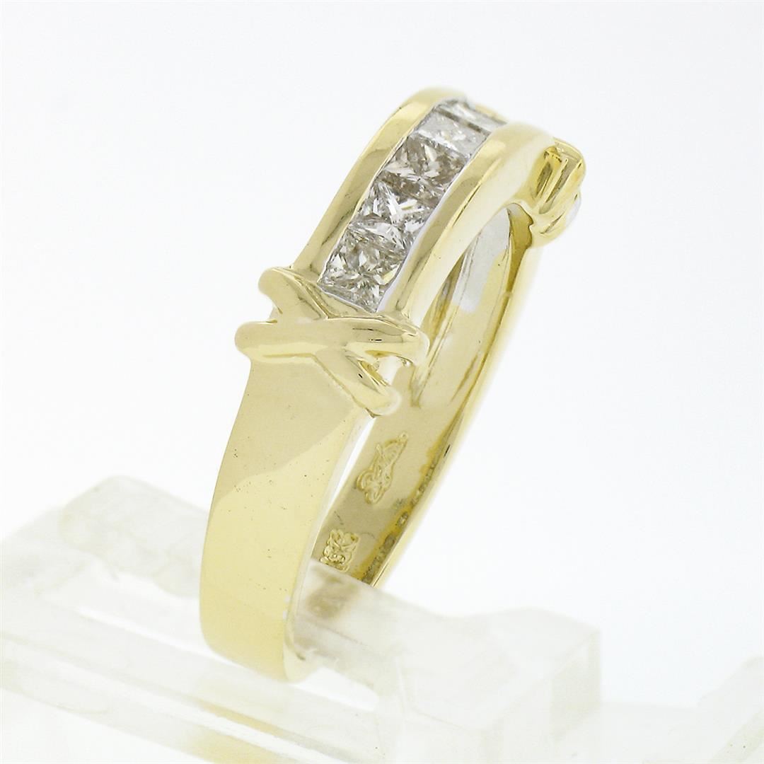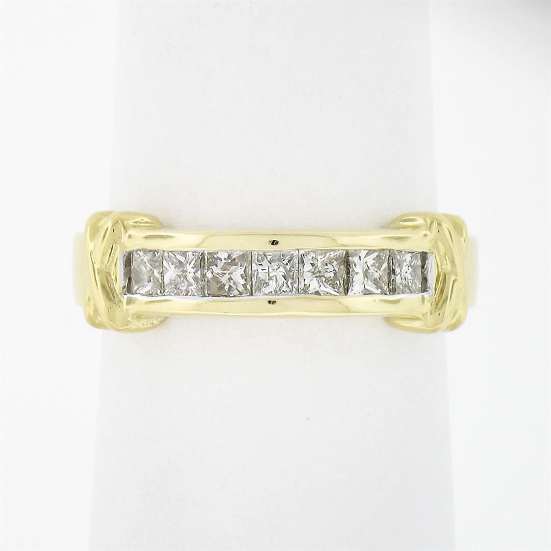 A solid 18k yellow gold band ring, with 7 princess cut natural diamonds (G/H - VS2/SI2 ; 0.70ctw). The ring is size 6.5, weighs a total of 5.11 grams, and measures 6.0mm wide.