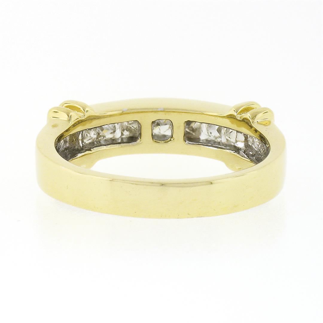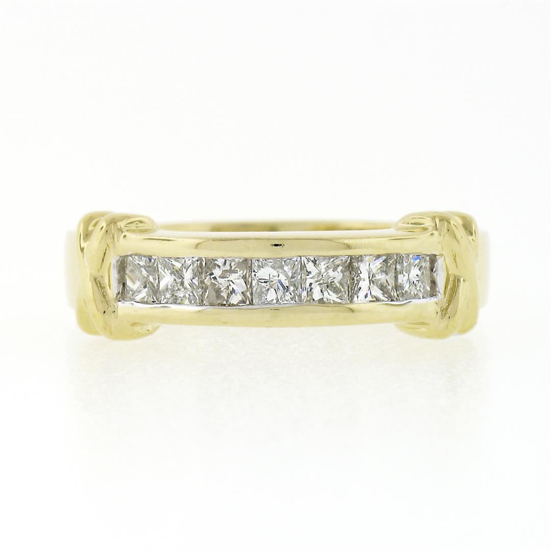 A solid 18k yellow gold band ring, with 7 princess cut natural diamonds (G/H - VS2/SI2 ; 0.70ctw). The ring is size 6.5, weighs a total of 5.11 grams, and measures 6.0mm wide.