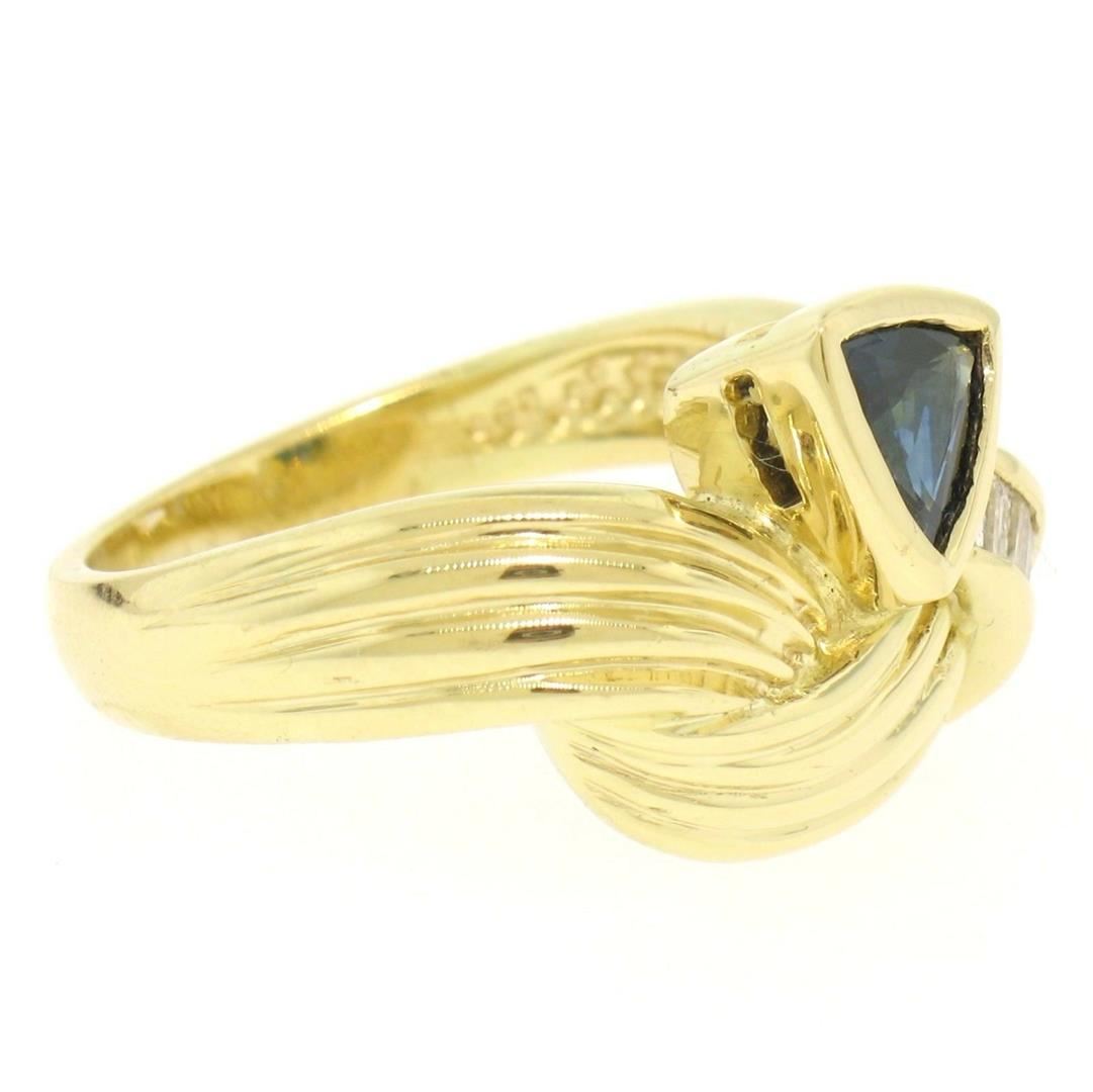 An 18k yellow gold cocktail ring featuring a bezel set trillion cut blue sapphire (0.80ct) accented by 8 channel set baguette cut diamonds (G/H - SI1/SI2; 1.04ctw). The ring is size 7, weighs a total of 8.60 grams, and measures 13.5mm wide.
