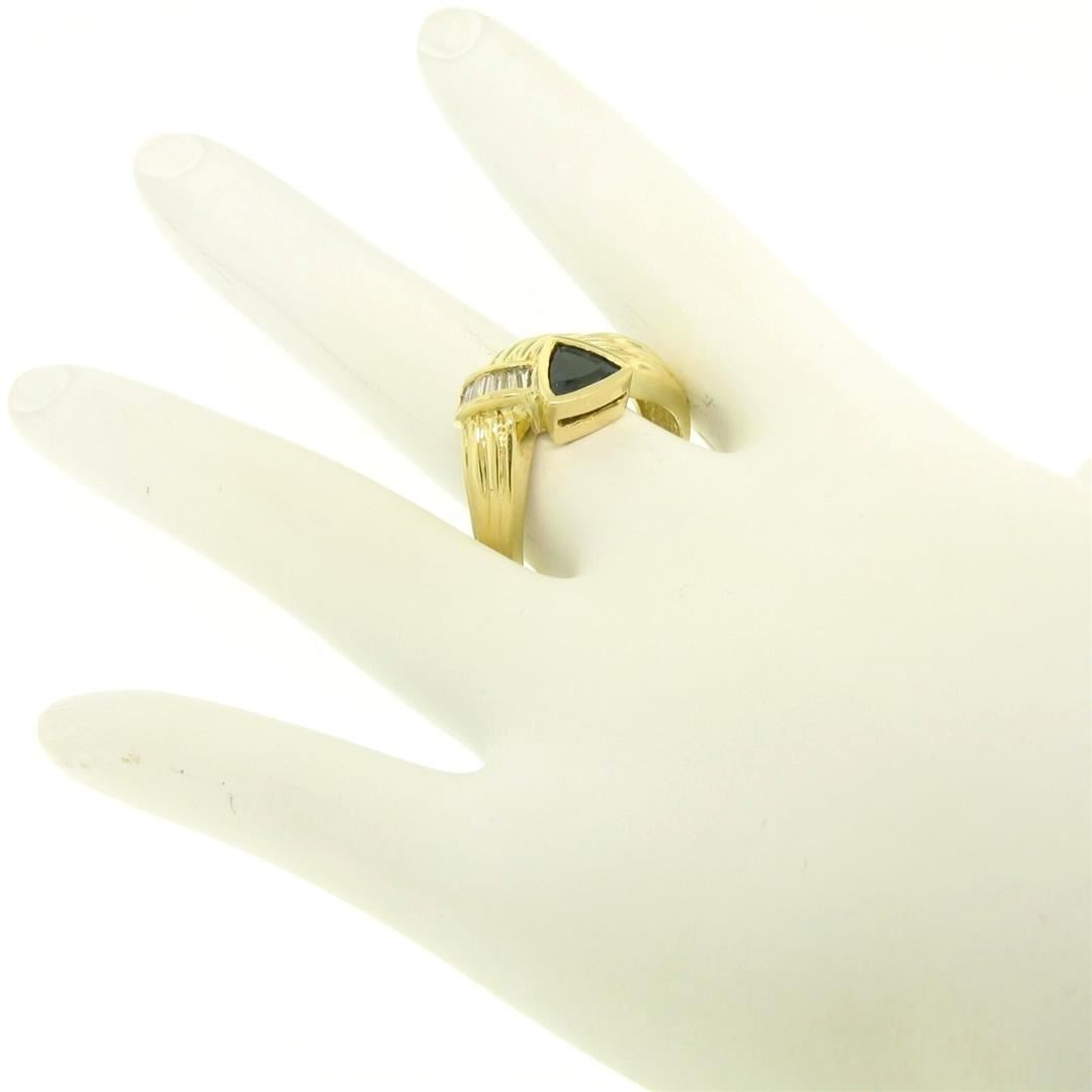 An 18k yellow gold cocktail ring featuring a bezel set trillion cut blue sapphire (0.80ct) accented by 8 channel set baguette cut diamonds (G/H - SI1/SI2; 1.04ctw). The ring is size 7, weighs a total of 8.60 grams, and measures 13.5mm wide.