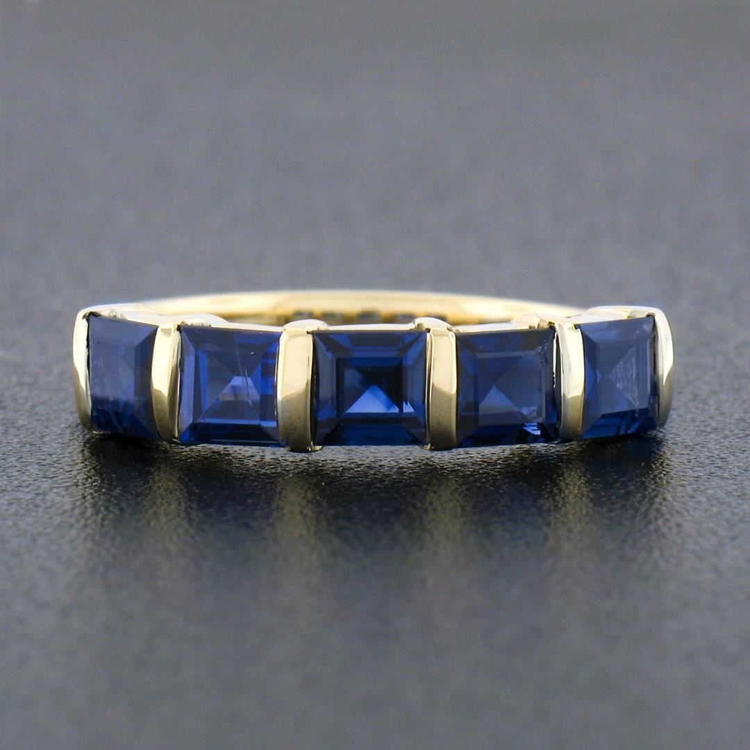 A solid 18k yellow gold 5 stone ring, with 5 square cut natural sapphires (1.75ctw). The ring is size 6.5, weighs a total of 3.86 grams, and measures 4.30mm wide.