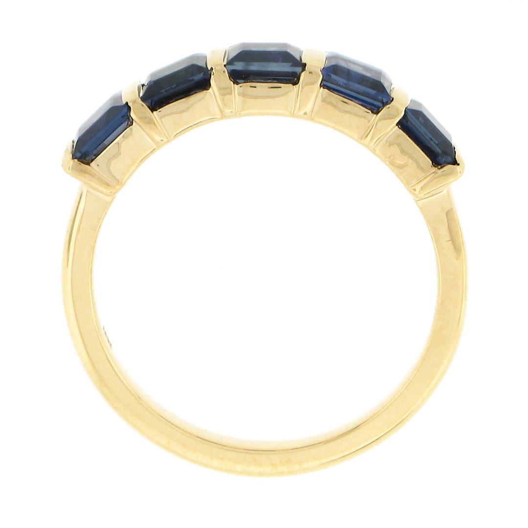 A solid 18k yellow gold 5 stone ring, with 5 square cut natural sapphires (1.75ctw). The ring is size 6.5, weighs a total of 3.86 grams, and measures 4.30mm wide.