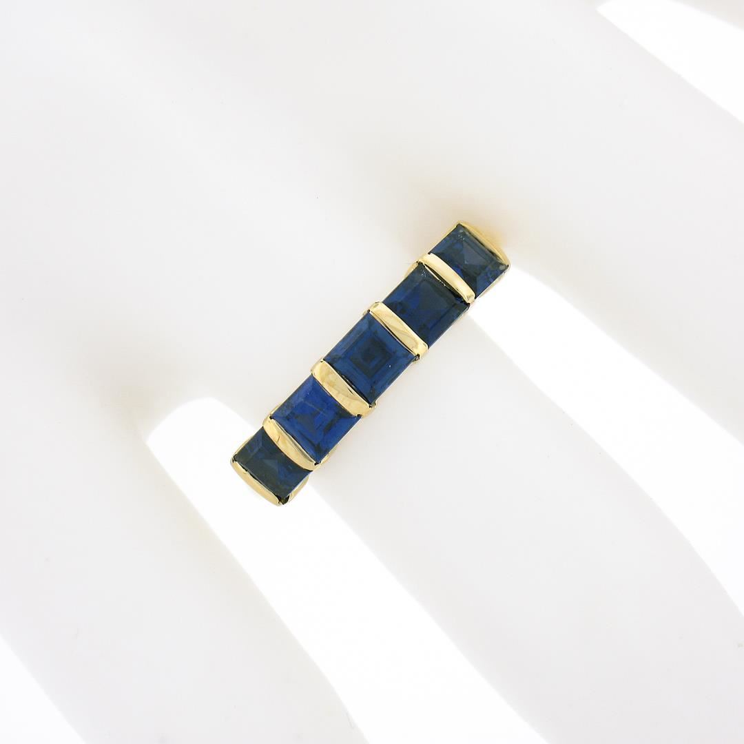 A solid 18k yellow gold 5 stone ring, with 5 square cut natural sapphires (1.75ctw). The ring is size 6.5, weighs a total of 3.86 grams, and measures 4.30mm wide.