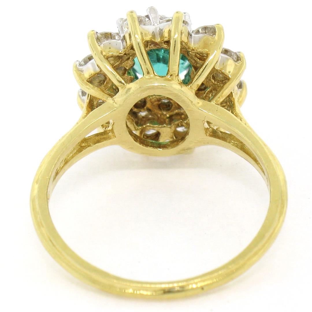 18k Yellow Gold 1.83ctw Oval Colombian Emerald Solitaire Dual Diamond Halo Ring. Please see photos and description for all available information. An estate solid 18k yellow and white gold solitaire ring, featuring 1 oval cut natural emerlad (0.83ct), surrounded with a halo of round brilliant cut natural diamonds (F- VS1; 1.00ctw). The ring is size 6.5, weighs a total of 4.97 grams, and measures 14.30mm wide.