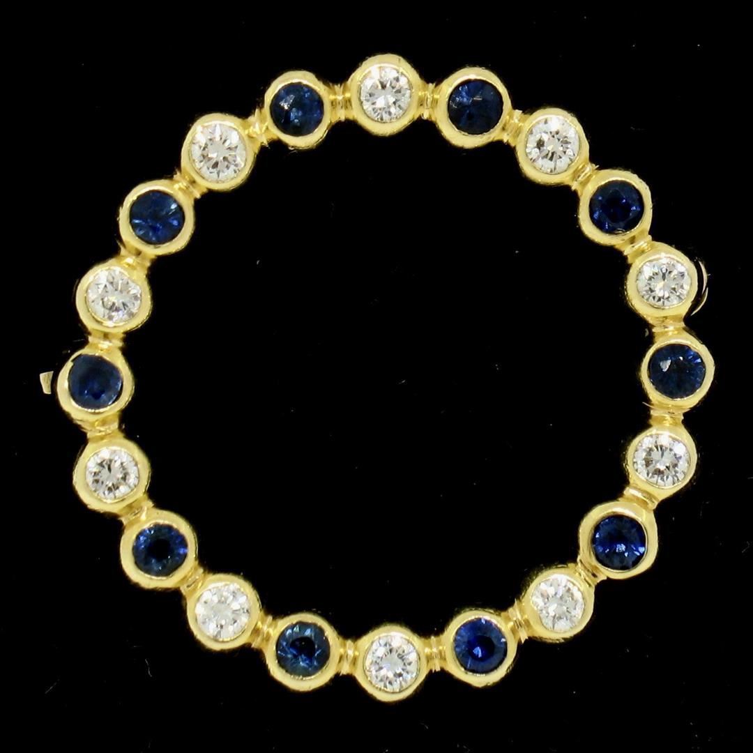 An estate solid 18k yellow gold wreath circle of life brooch, featuring 10 round cut natural sapphires (0.35ctw), alternated with 10 round brilliant cut natural diamonds (F/G - VS1/VS2 ; 0.35ctw). Measures 23.0mm in dimension and weighs a total of 4.18 grams.