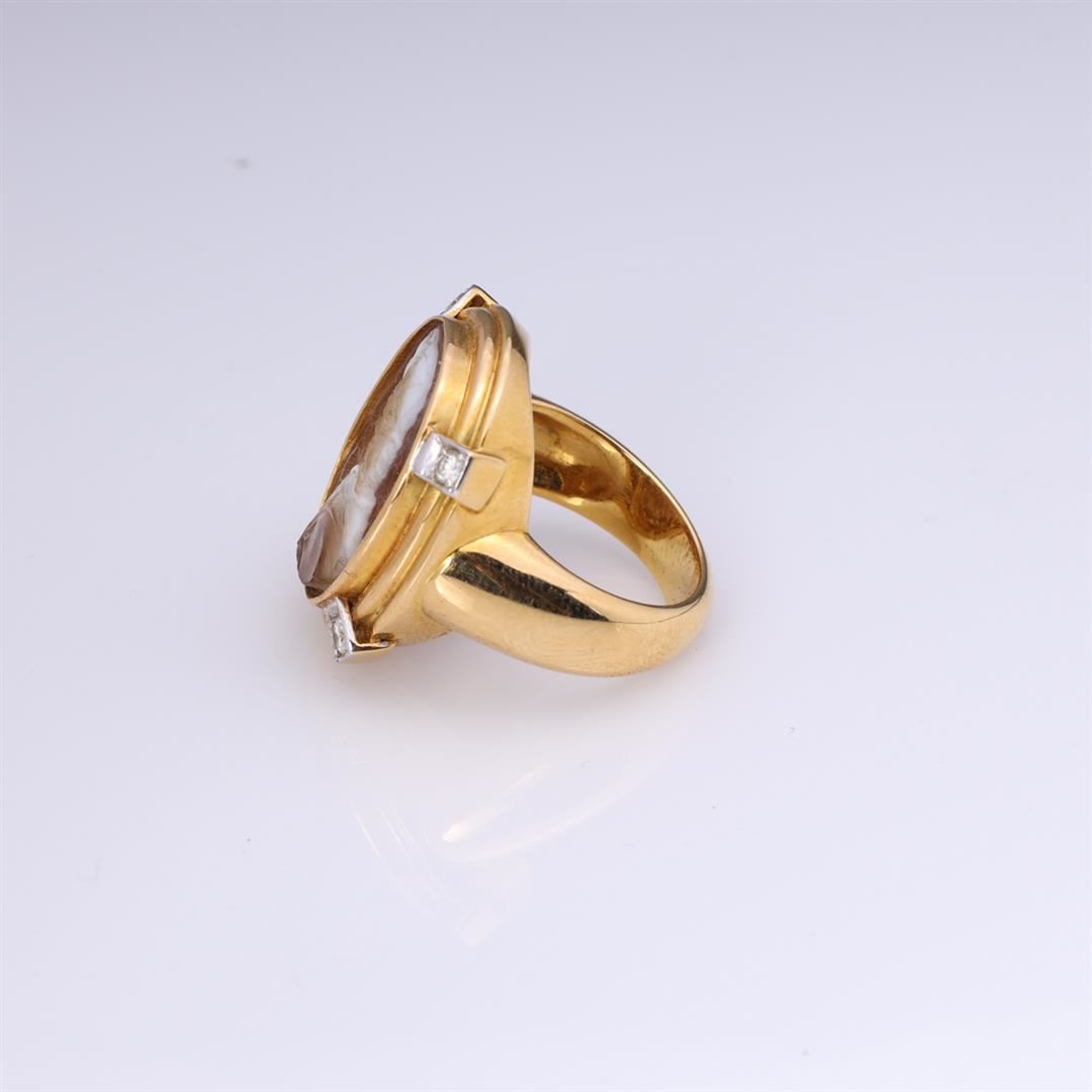 18k Yellow Gold Cameo Agate & Diamond Ring containing four brilliant cut round diamonds weighing approximately 0.15 cts. Total weight of ring is 15 gm. Estimated retail value $4,800.