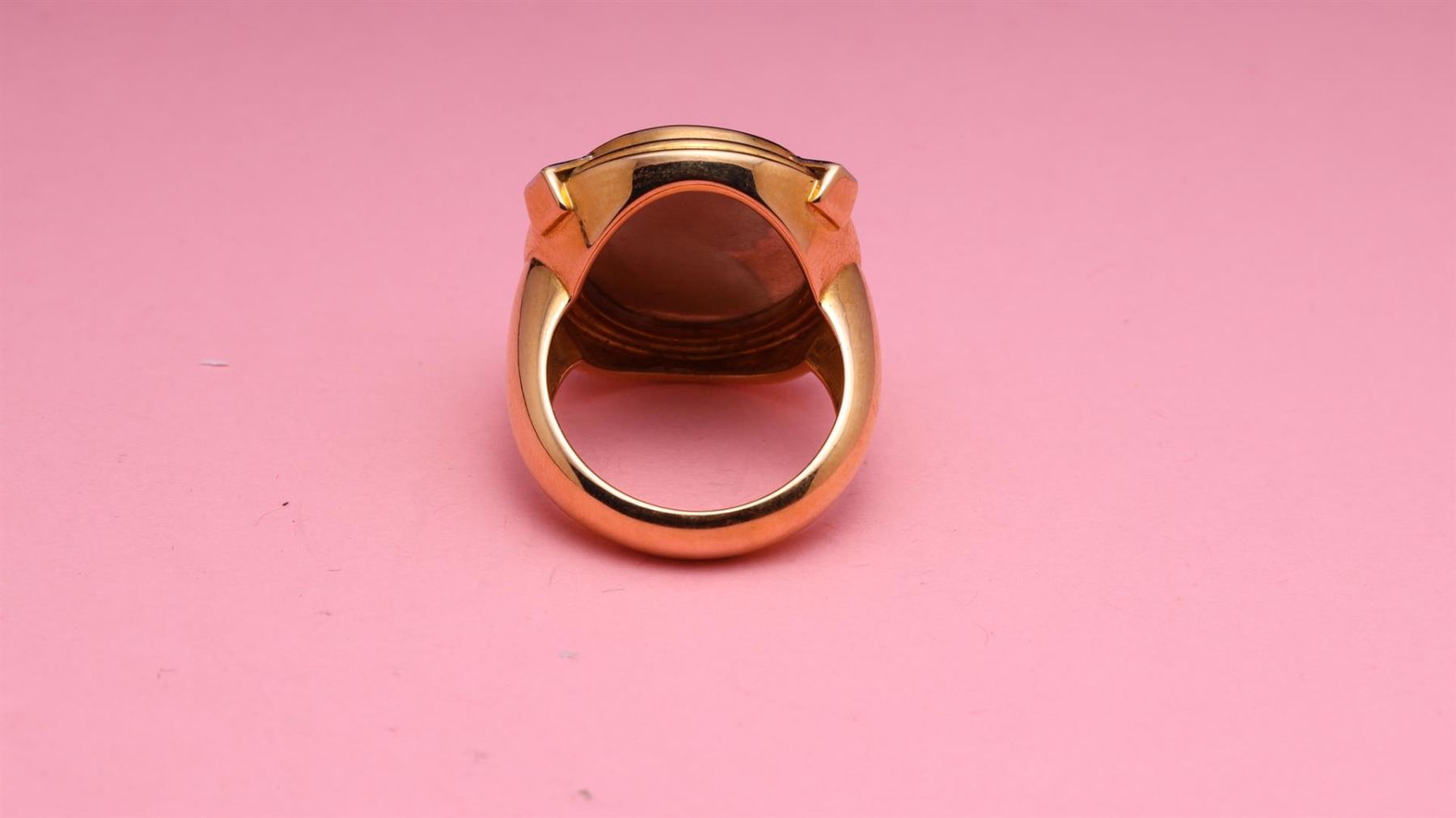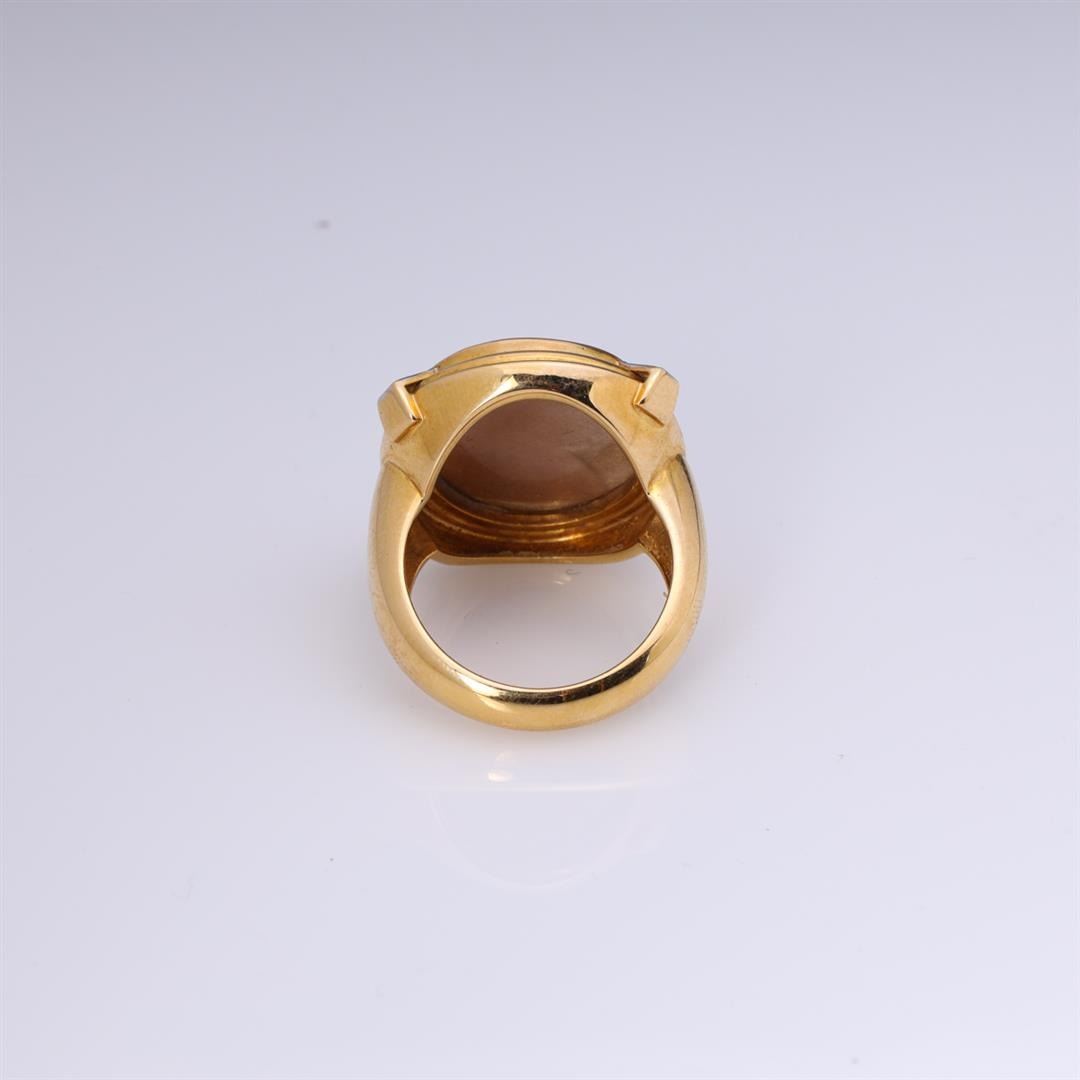 18k Yellow Gold Cameo Agate & Diamond Ring containing four brilliant cut round diamonds weighing approximately 0.15 cts. Total weight of ring is 15 gm. Estimated retail value $4,800.
