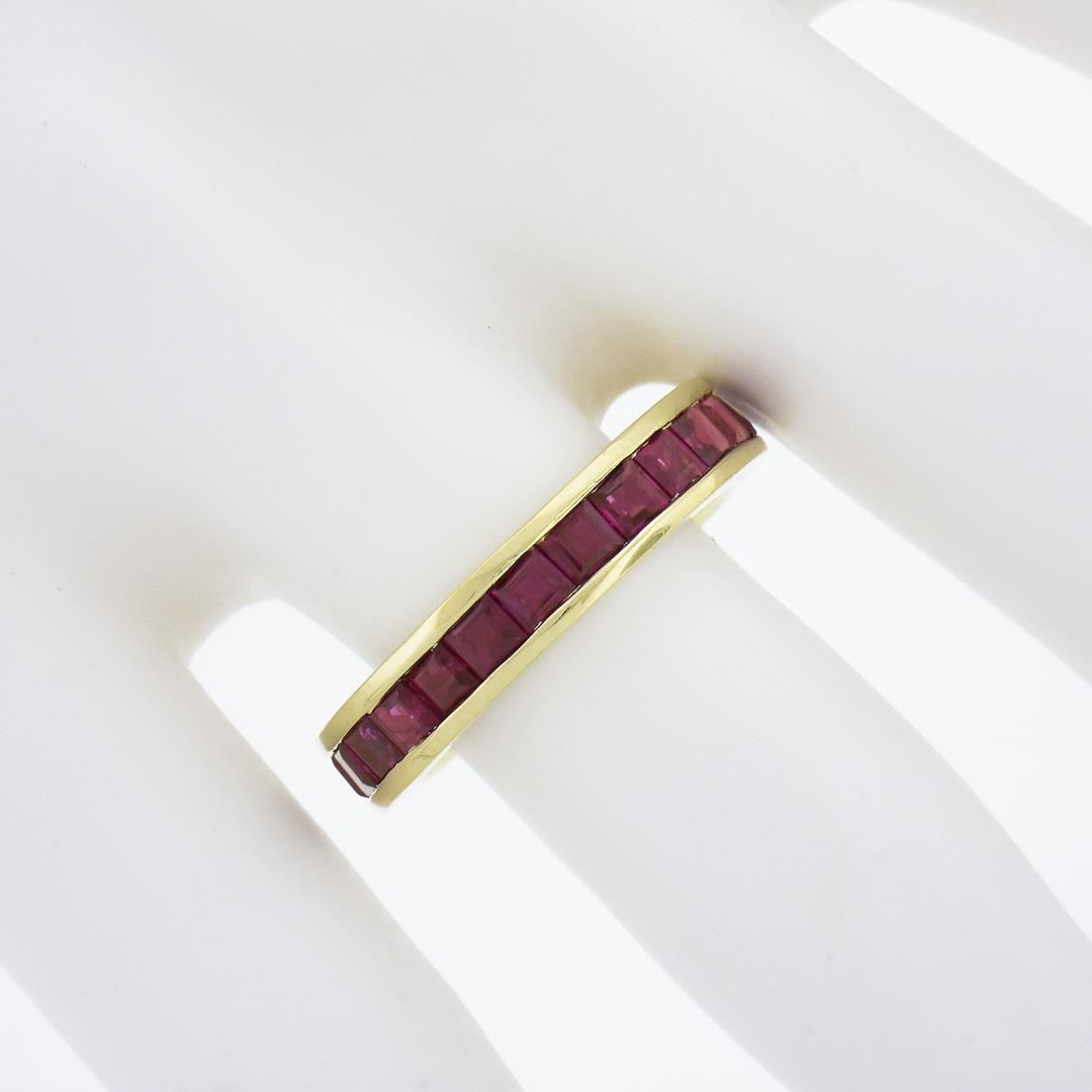 A solid 18k yellow gold eternity band ring, with GIA graded 24 square cut natural rubies (3ctw). The ring is size 6.75, weighs a total of 5.34 grams, and measures 4.43mm wide. Comes with all original relevant certifications