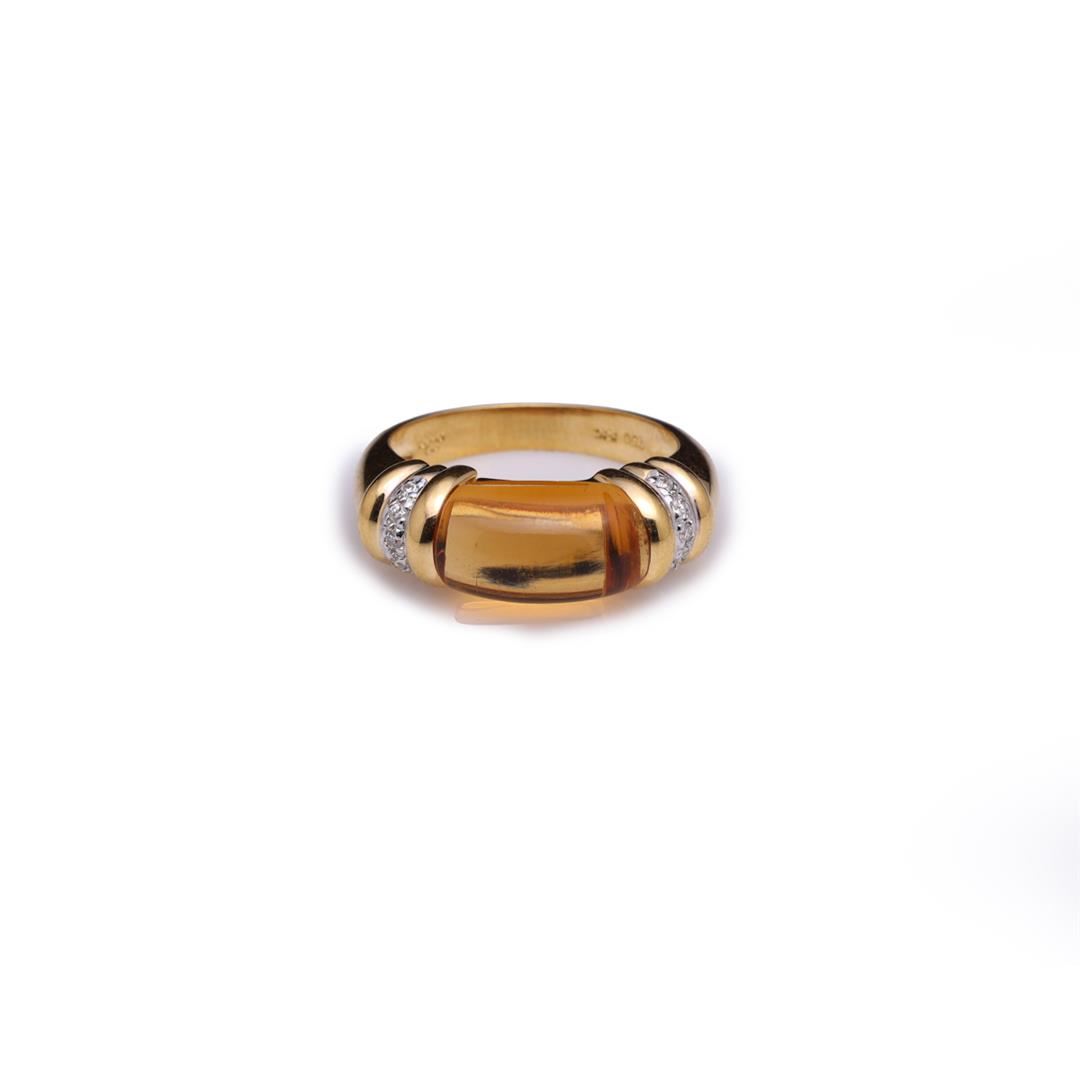 18k yellow gold ring; the center stone an eye clean citrine cabochon with gold ribs and diamond accents to each shoulder, interior band marked 750 18k with hallmark; gross weight 5.9 g, size 6 1/2