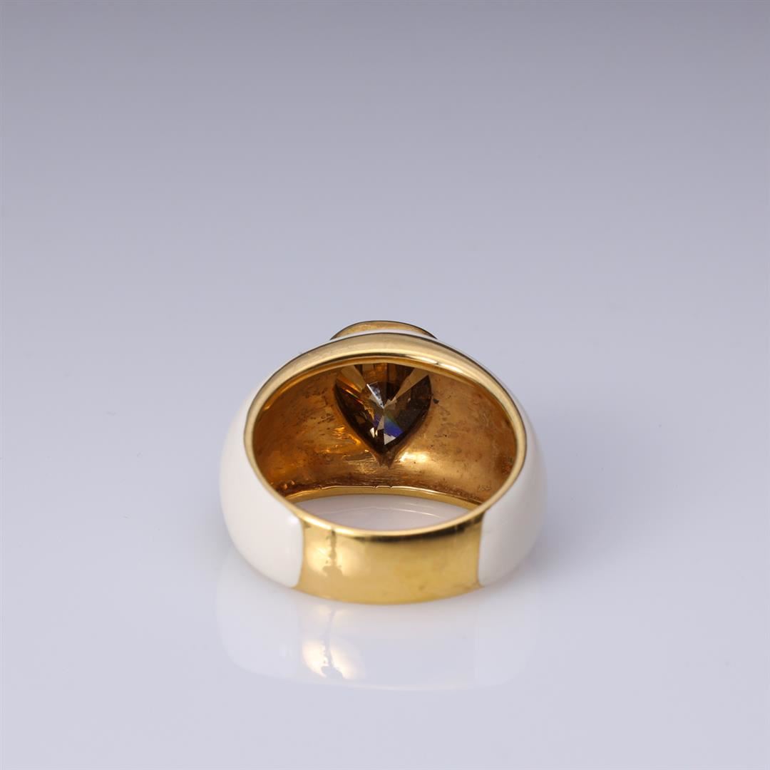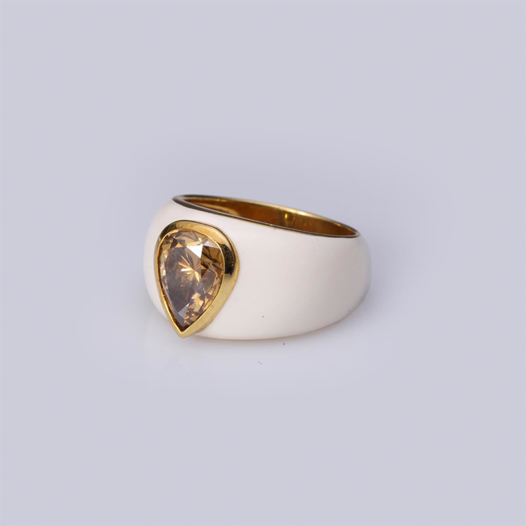 The large pear shaped cognac diamond bezel set in an 18k yellow gold ring with thick enamel to shoulders and shank, marked 18k to interior band; overall good condition; gross weight 11.3 g, size 7 1/2