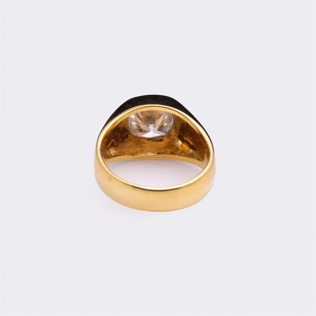18k yellow gold ring set with large moissanite, marked 750 to interior band; gross weight 9.3 g, size 7 3/4