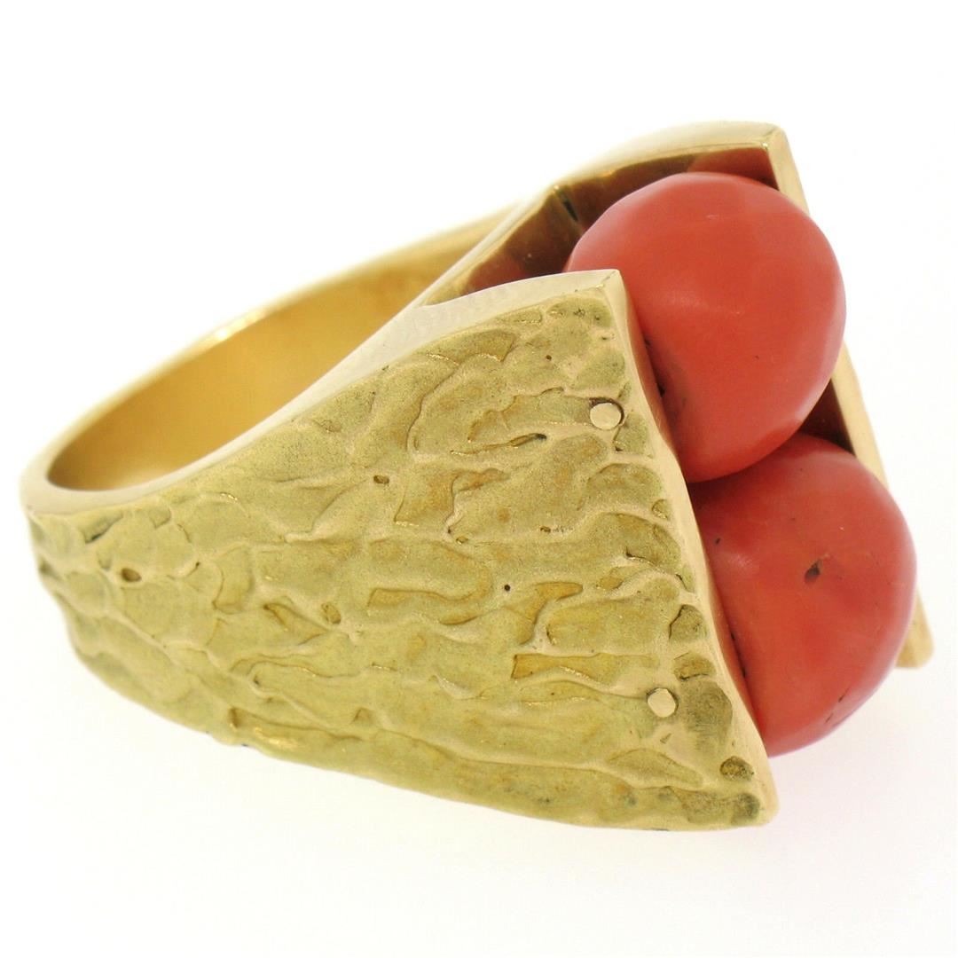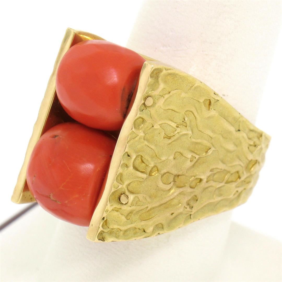 One 18k Yellow Gold Two Spinning Faceted Coral Bead Ring Textured Matte Finish 40.1g. Item Details: Material: Solid 18K Yellow Gold, Weight: 40.1 Grams ( VERY SOLID AND HEAVY), Stone(s): (2) Natural Genuine Coral - Round Bead Shape - Deep Red Color - 9.5-10.9mm (approx.), Ring Size: 8 , Ring Width: 20.75mm, Ring Height: 12.93mm rise off the finger, Condition: Like New!,