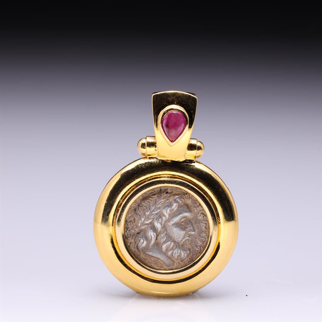 18k Yellow Gold Tourmaline & Greek Coin Pendant containing pear shaped pink tourmaline weighing approximately 0.50 cts. Total weight is 16 gm. Estimated retail value $2,800.