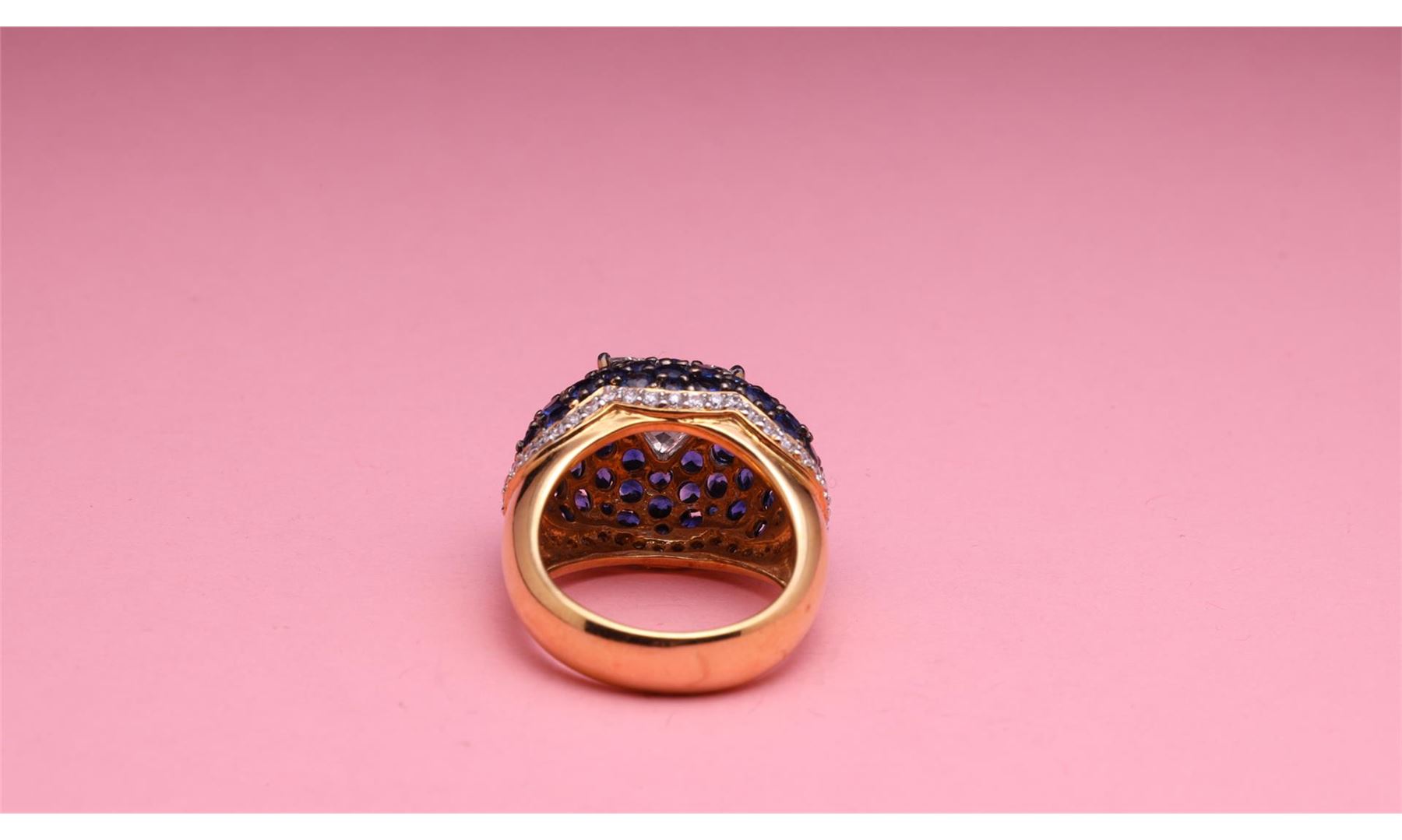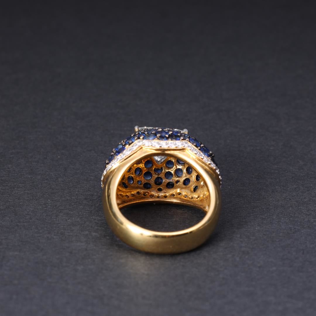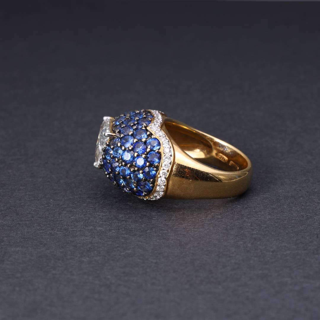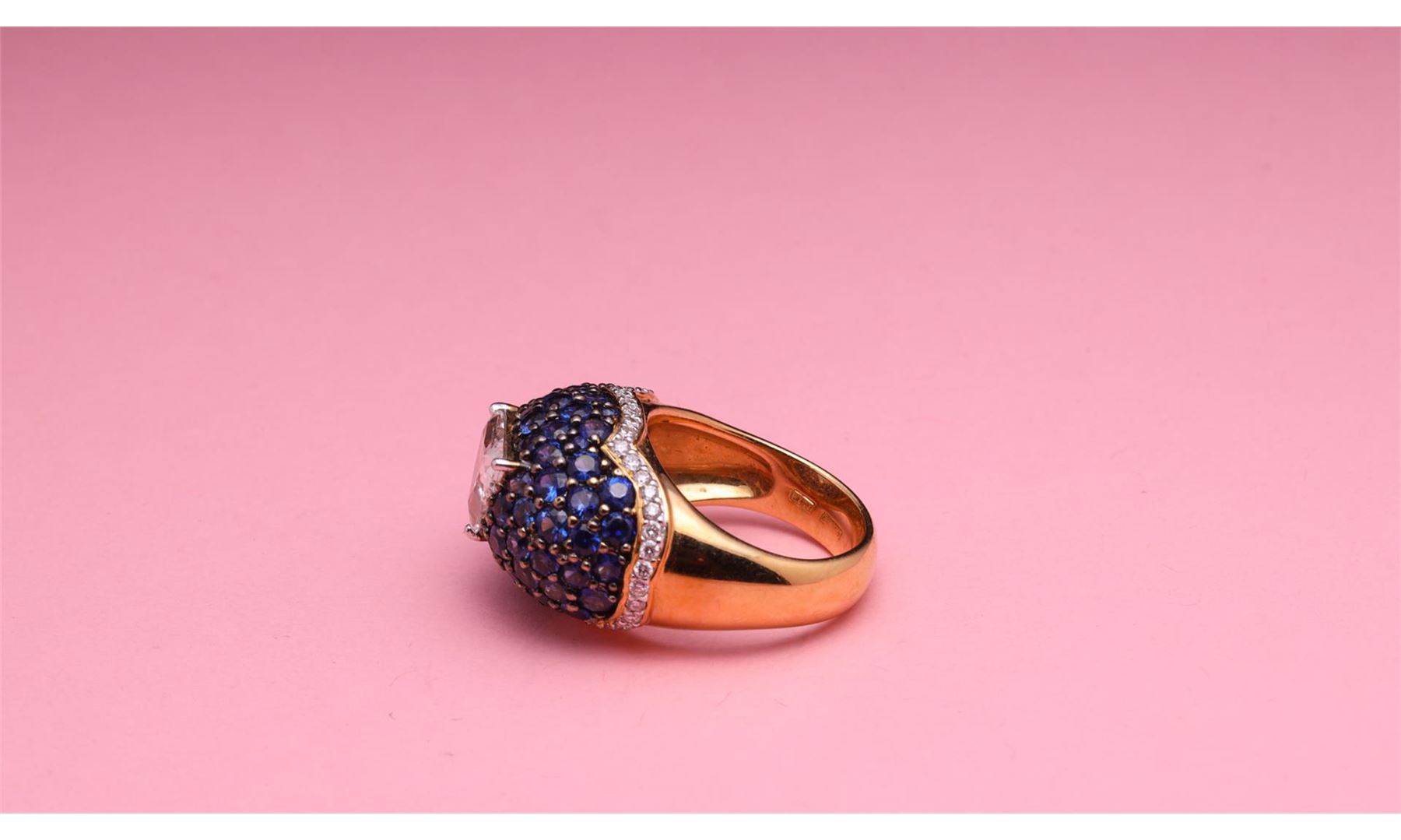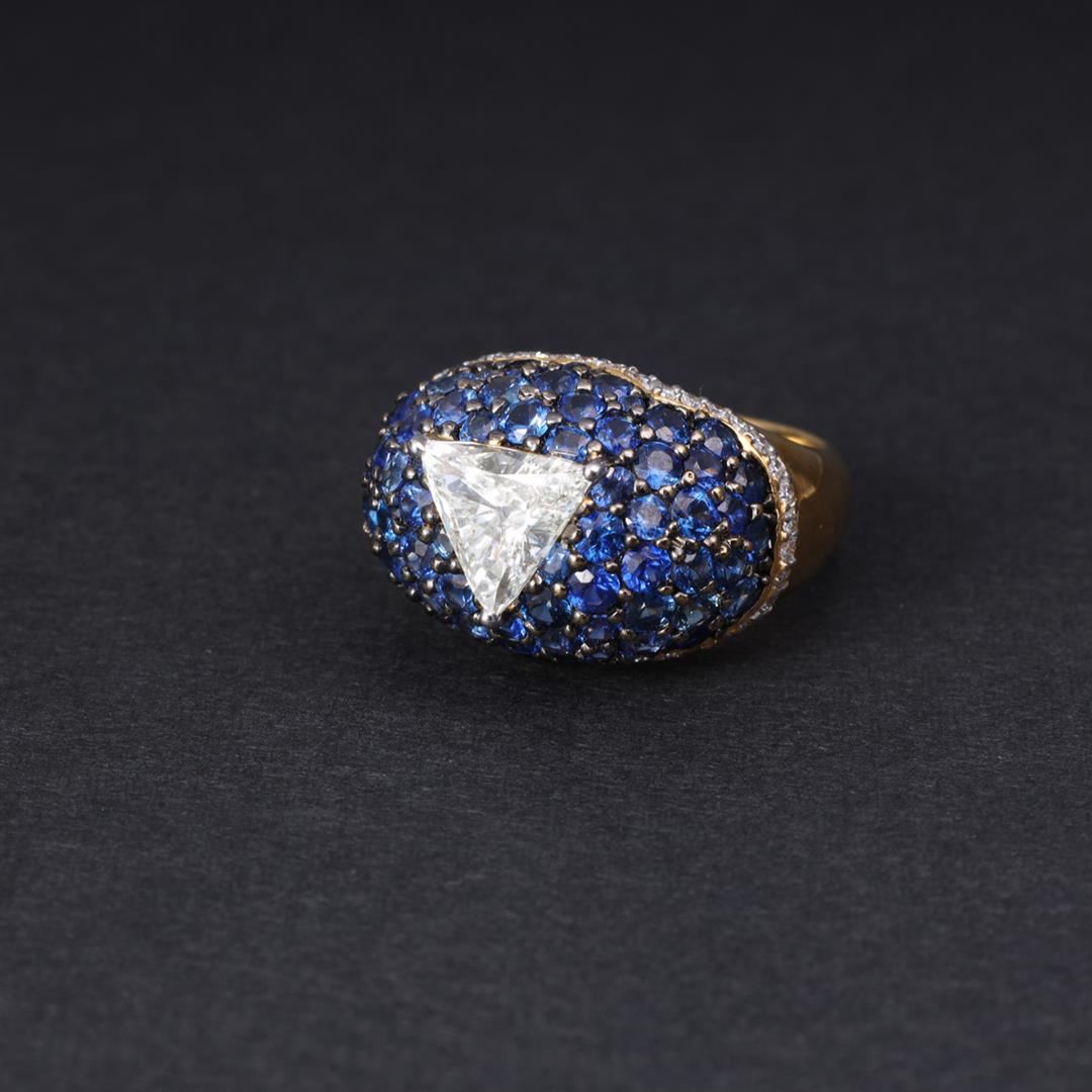 18k yellow gold ring; center set with trillion cut diamond surrounded by numerous sapphires, at the base a single row of white diamonds; marked RICI CR750 to interior; gross weight 15 g, size 7