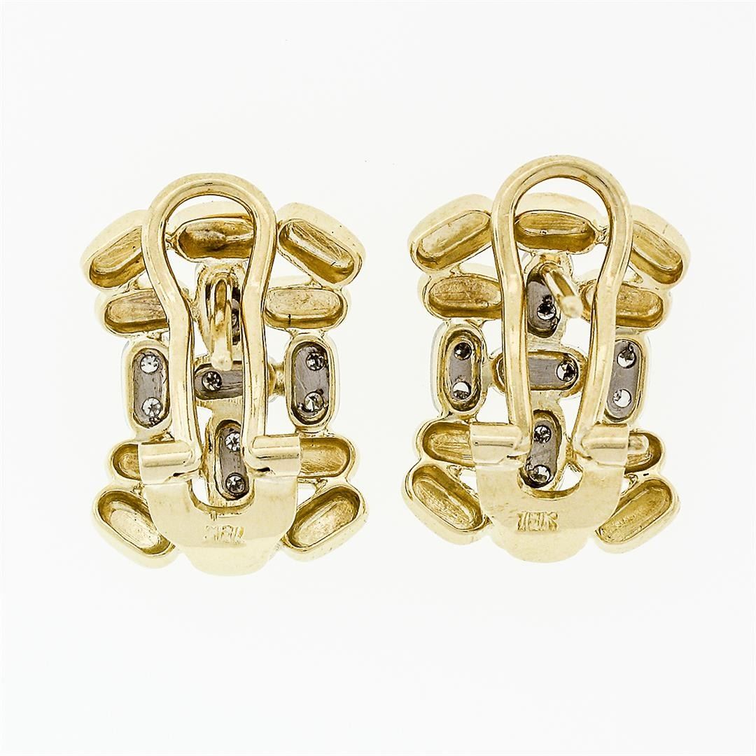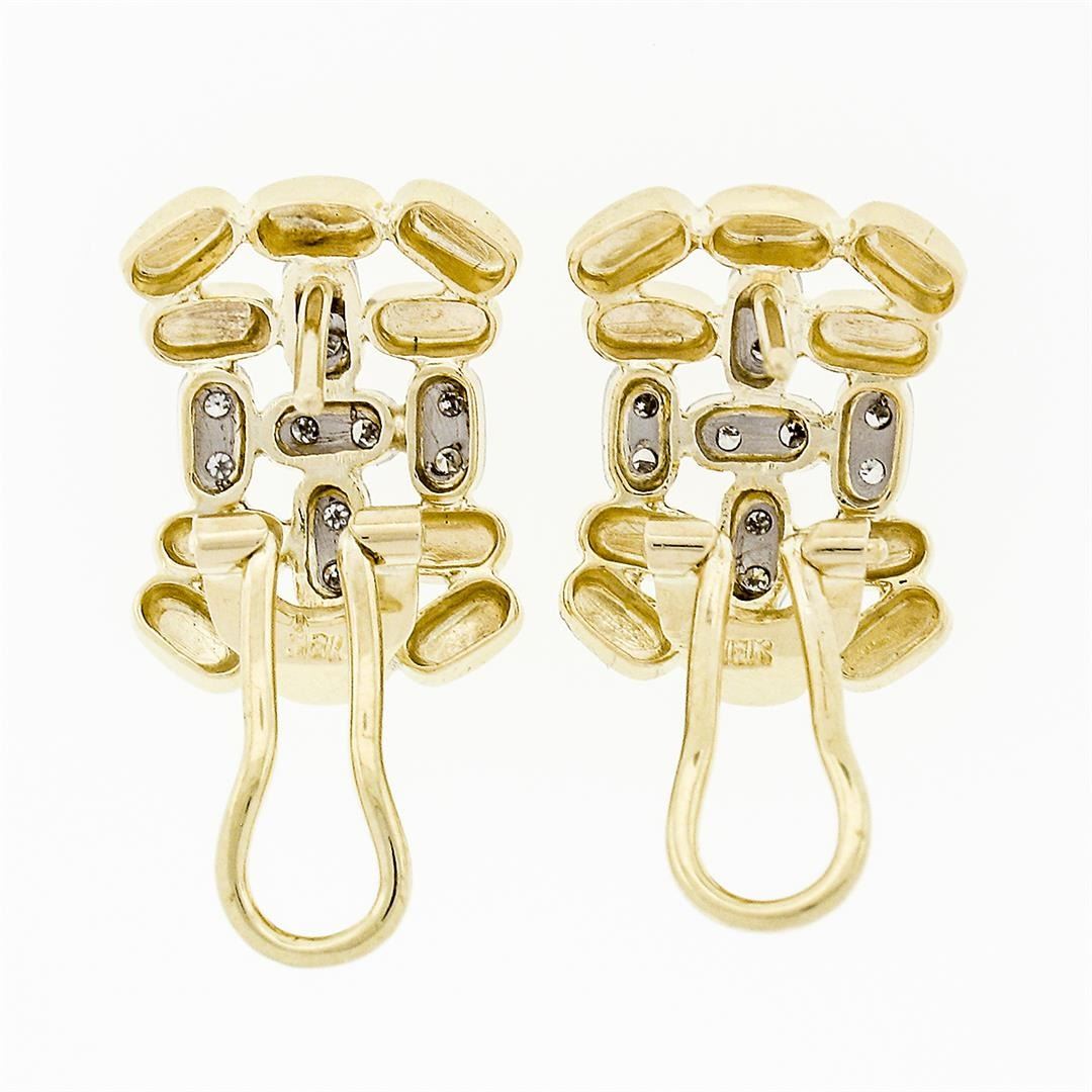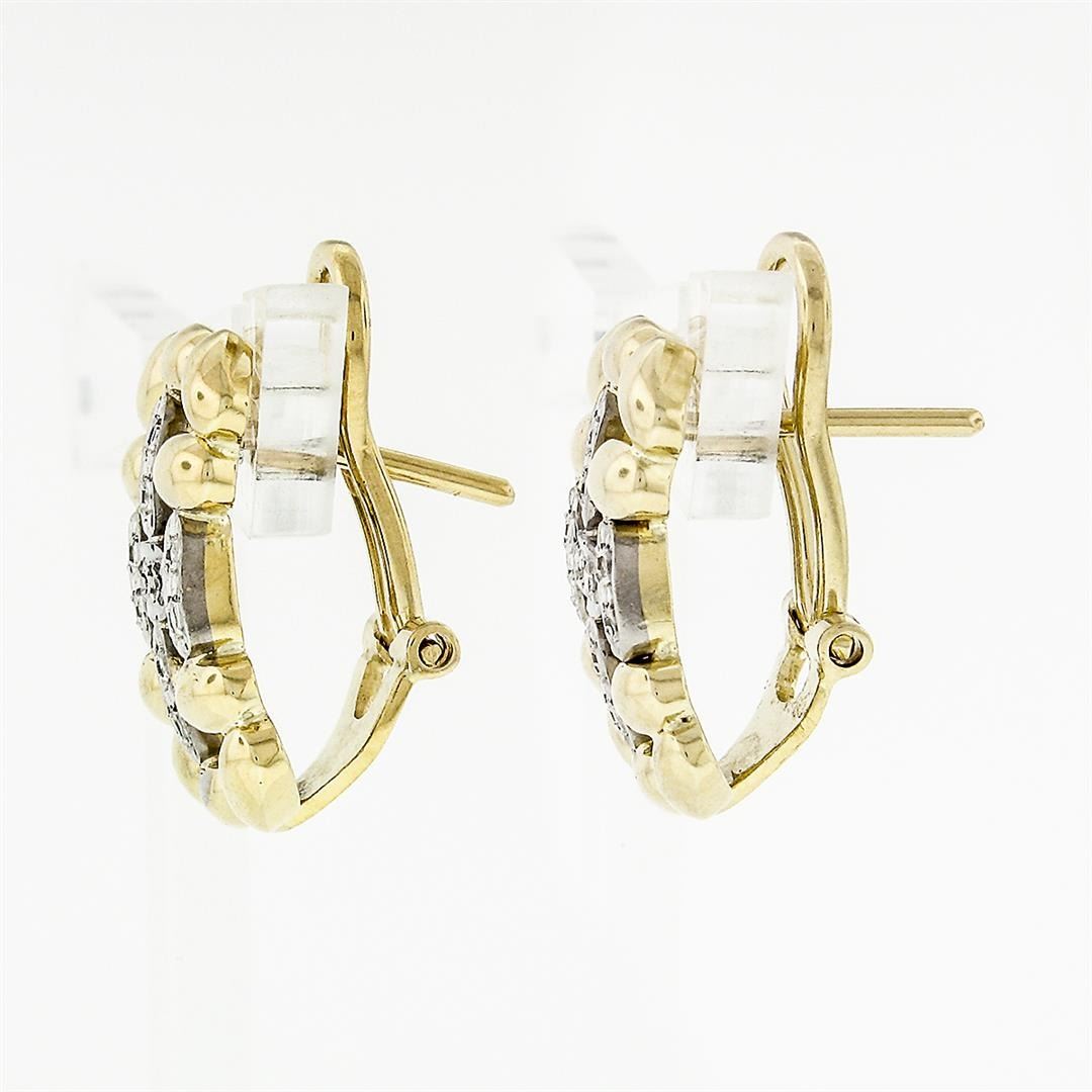 An estate solid 18k yellow & white gold omega earrings, with 20 round single cut natural diamonds (G - VS2/SI1 ; 0.20ctw). The earrings measure approximately 18.81x14.47mm and weigh a total of 9.68 grams.
