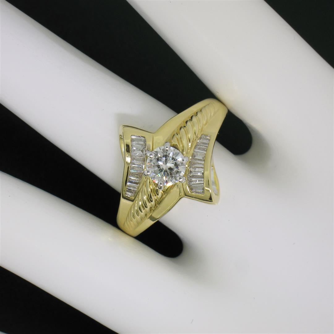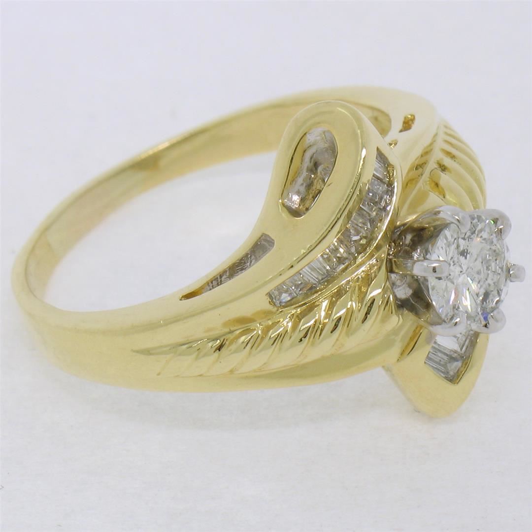 An 18k yellow and white gold diamond bypass ring with a 0.53ct round solitaire (G - I1) and 0.37ctw of baguettes (G/H - VS2). The ring is size 8.5, weighs a total of 7.5 grams, and measures 16.5mm wide.
