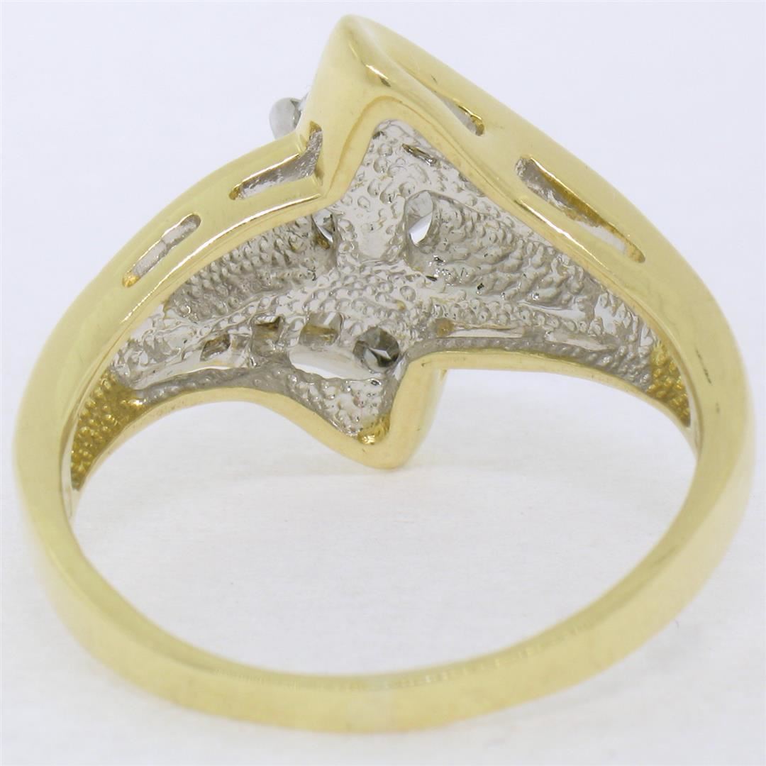 An 18k yellow and white gold diamond bypass ring with a 0.53ct round solitaire (G - I1) and 0.37ctw of baguettes (G/H - VS2). The ring is size 8.5, weighs a total of 7.5 grams, and measures 16.5mm wide.