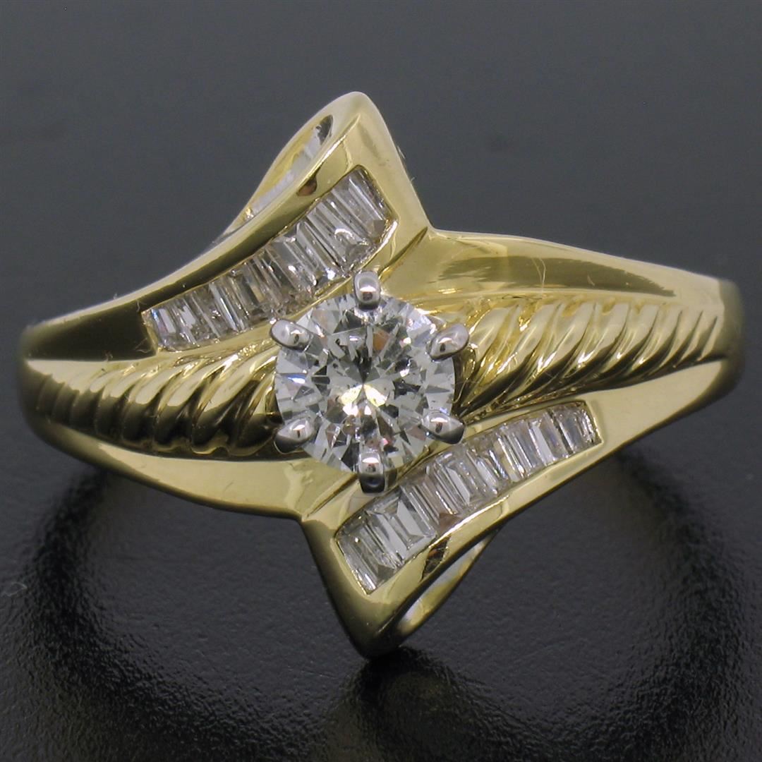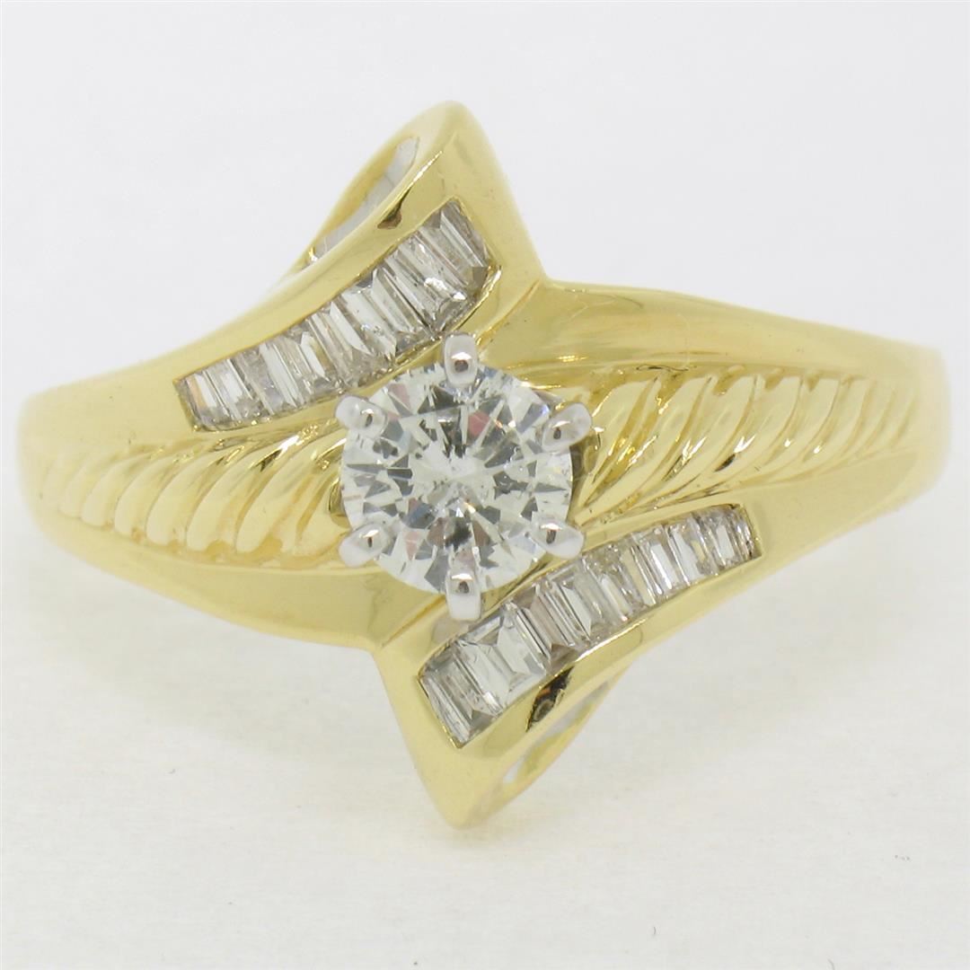 An 18k yellow and white gold diamond bypass ring with a 0.53ct round solitaire (G - I1) and 0.37ctw of baguettes (G/H - VS2). The ring is size 8.5, weighs a total of 7.5 grams, and measures 16.5mm wide.