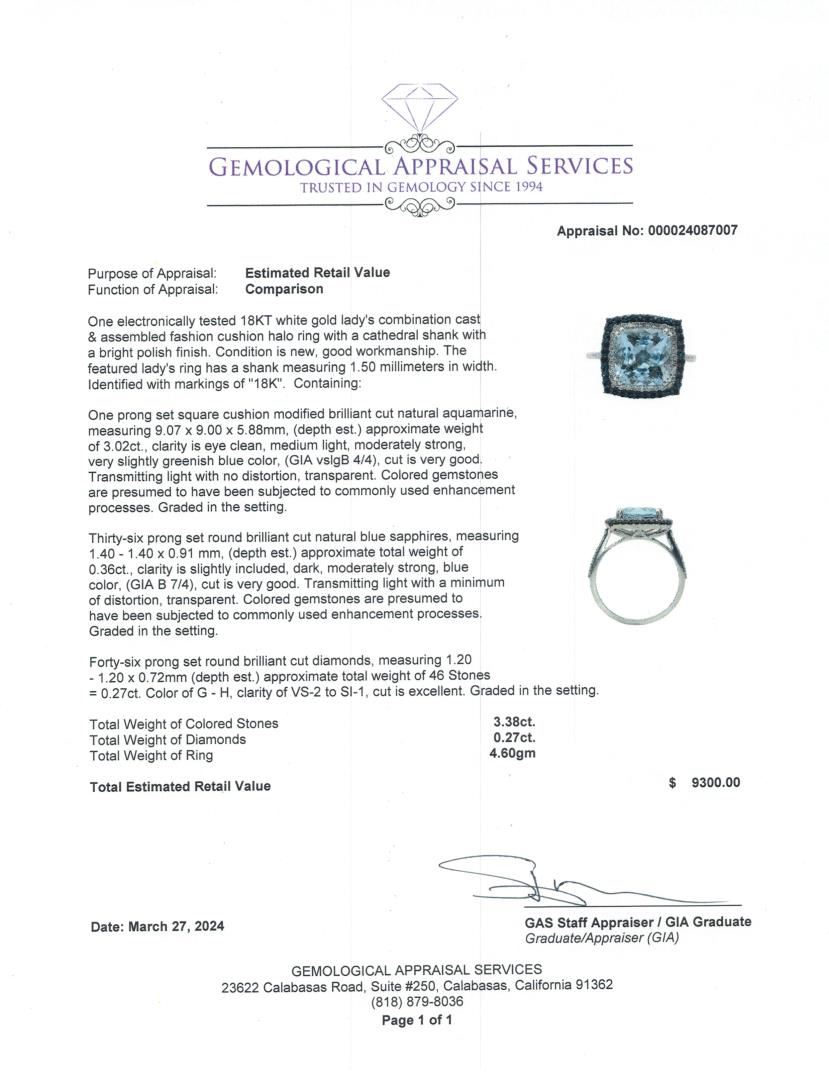 This elegant 18kt white gold cushion halo ring showcases a stunning 3.02ct prong-set square cushion modified brilliant-cut natural aquamarine, displaying a medium light, slightly greenish blue hue with eye-clean clarity. Enhancing the centerpiece are 36 prong-set round brilliant-cut natural blue sapphires totaling 0.36ct, offering a rich dark blue contrast. Completing the design, 46 prong-set round brilliant-cut diamonds weighing 0.27ct (G-H color, VS-2 to SI-1 clarity, Excellent cut) bring a radiant sparkle to the halo and band. The cathedral shank and bright polish finish add a touch of sophistication to this refined statement piece.